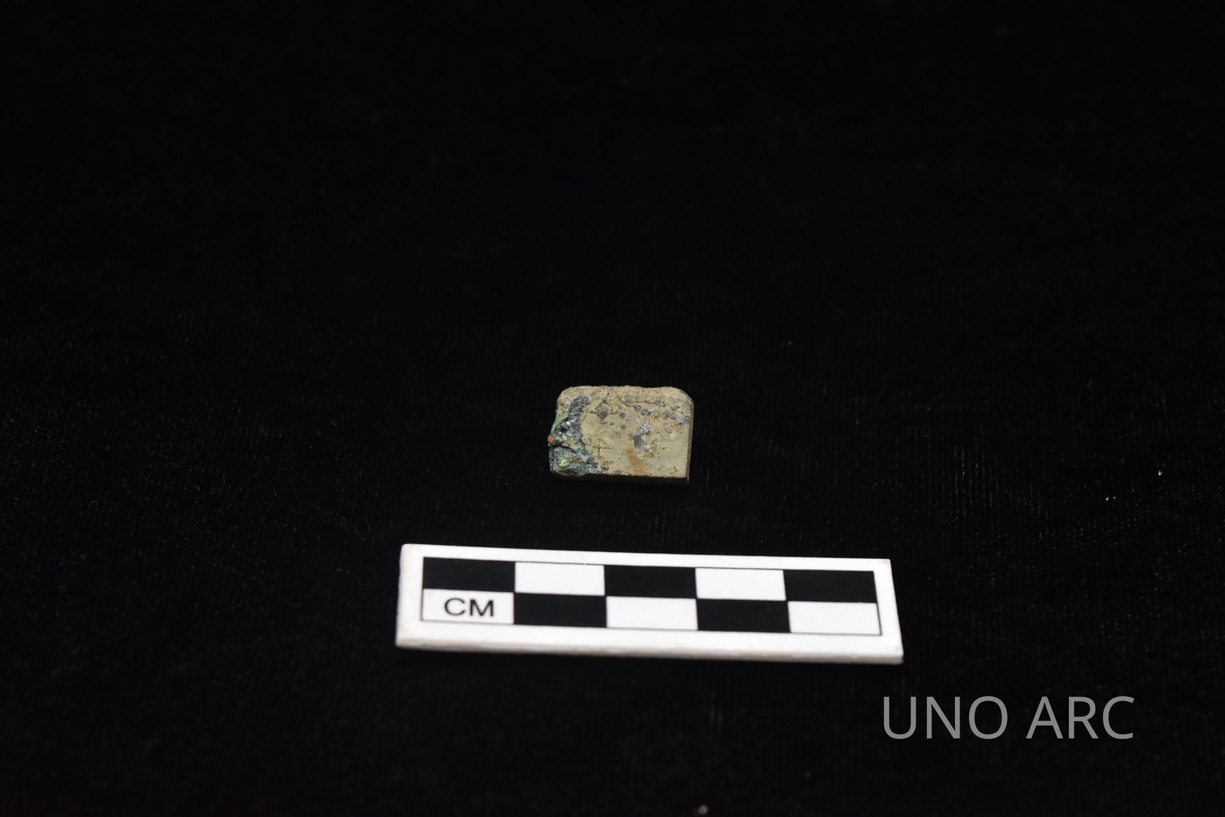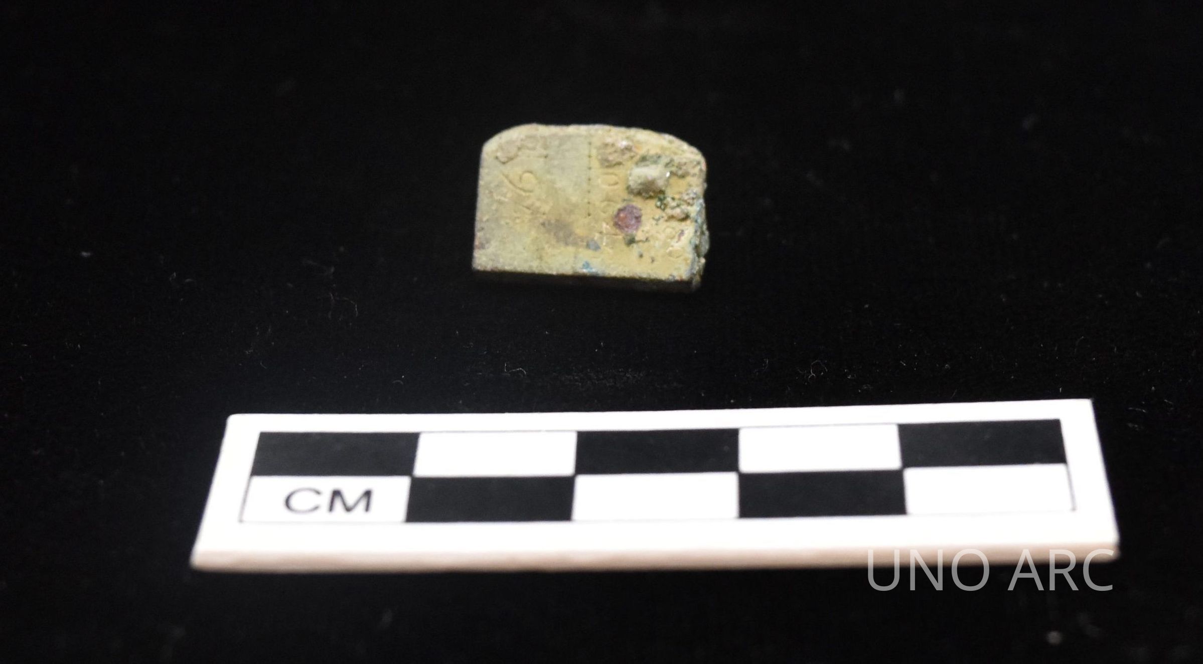 Heavily corroded metal piece with inscription: "16"/ ".....064"; potentially part of a scale. Scales used to measure silver and gold measurements typically measured in increments related to .0016 g.Created By