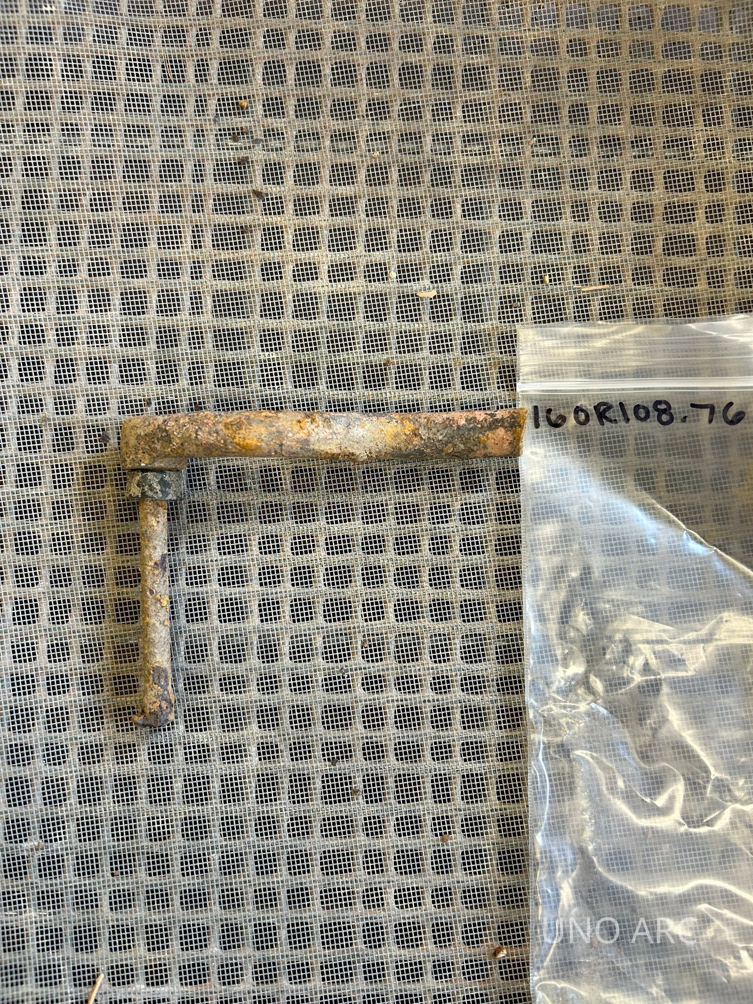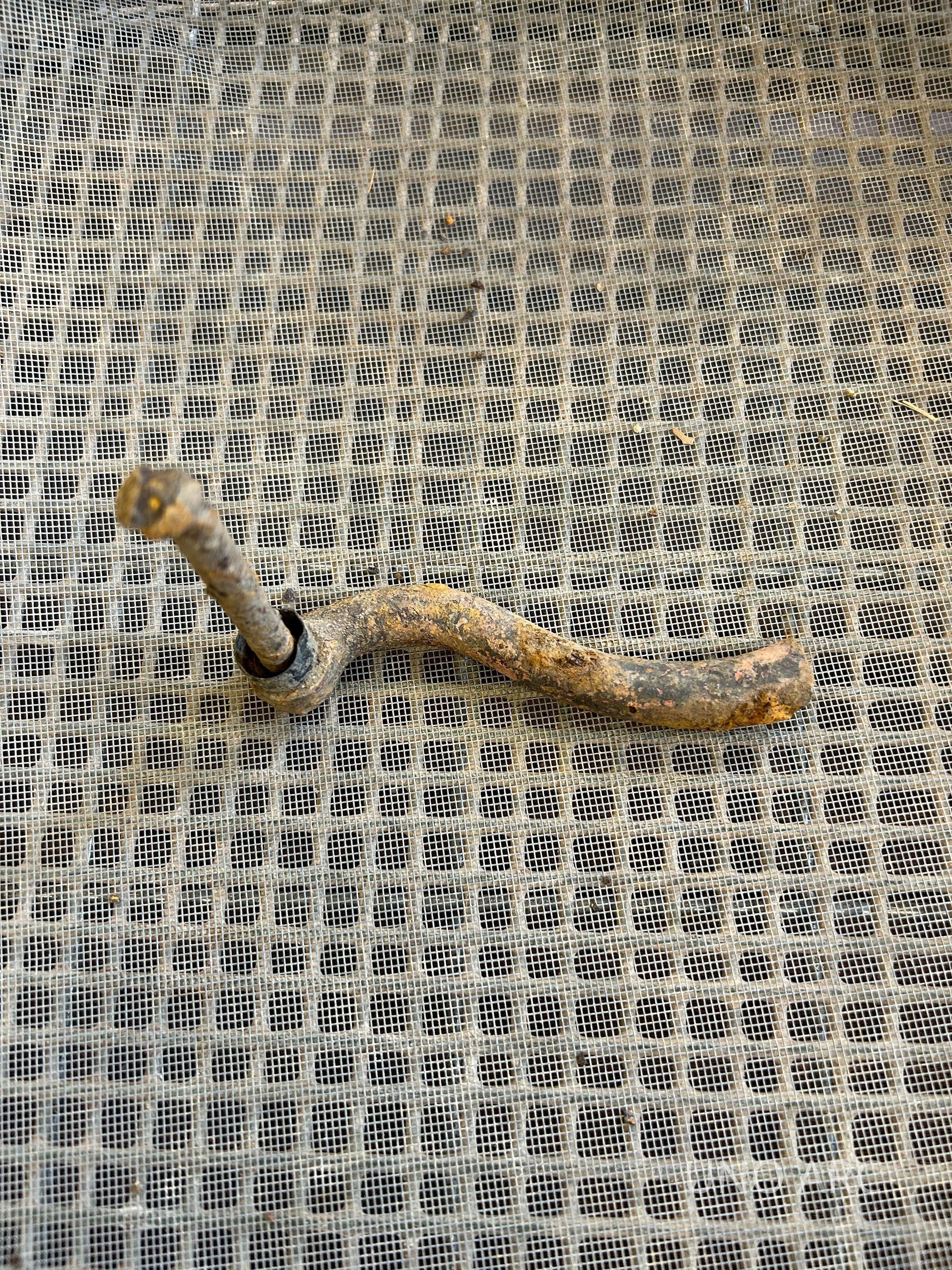 Curved, flared towards end of handle. Separate thin, cylindrical, metal piece around spindle.Context