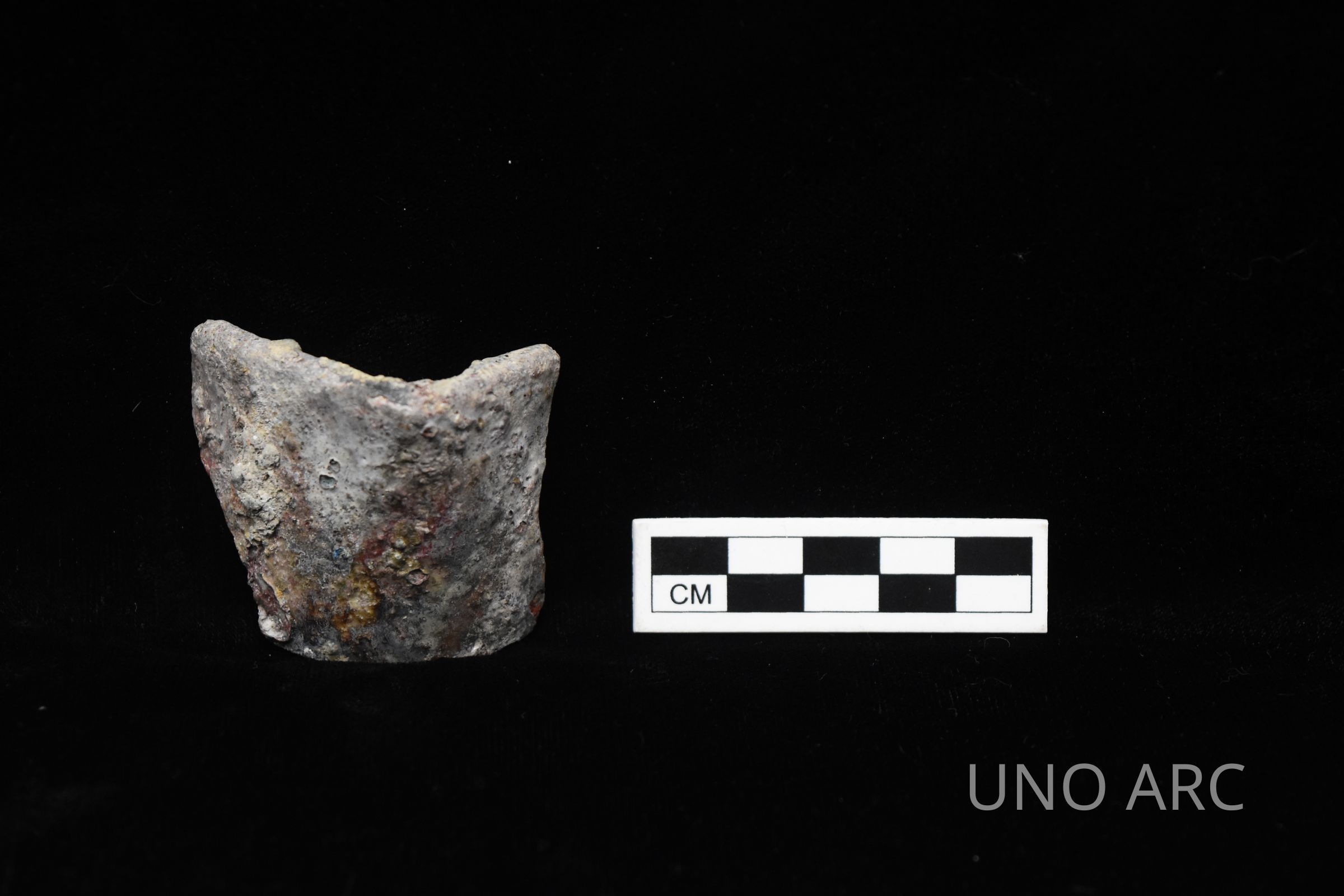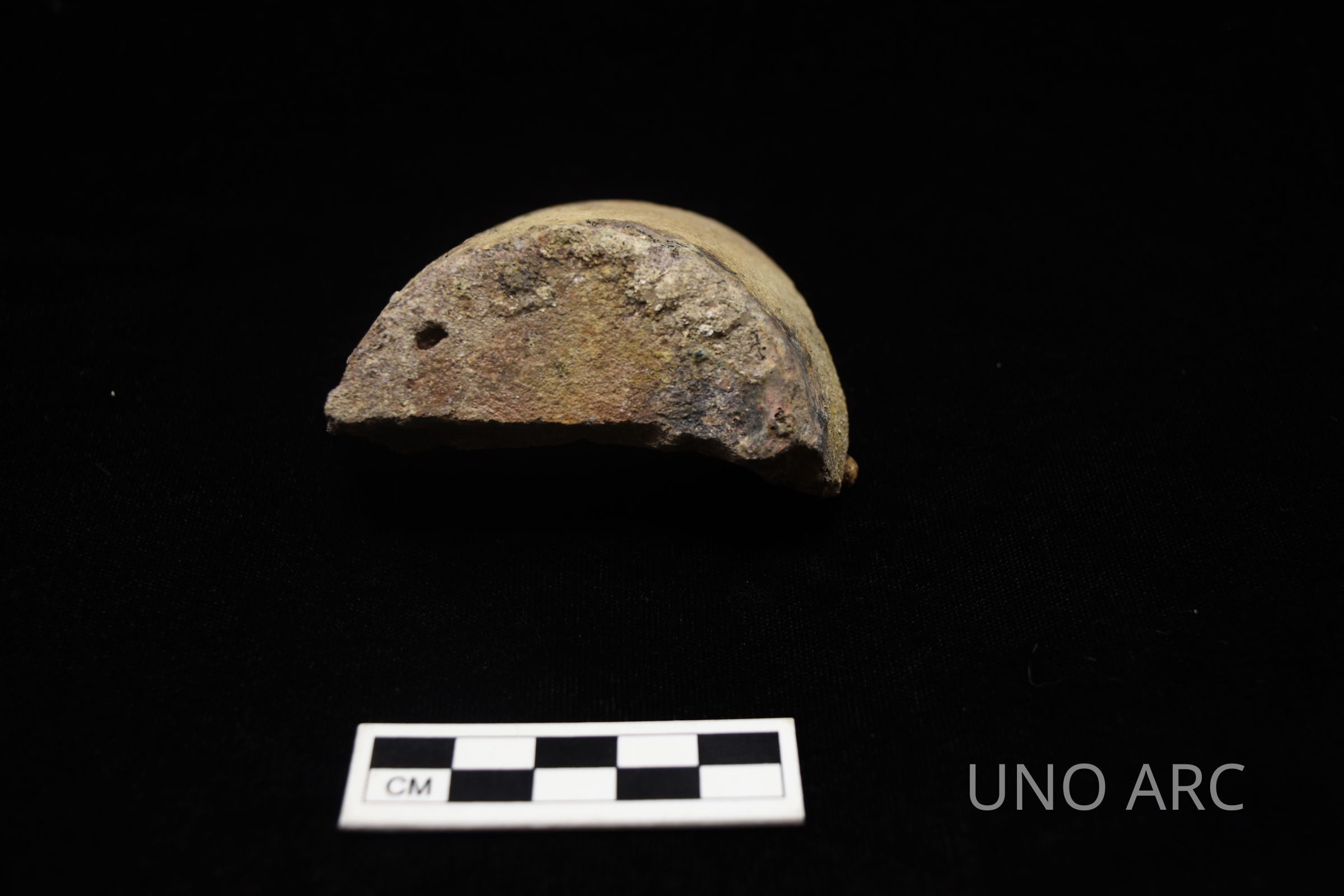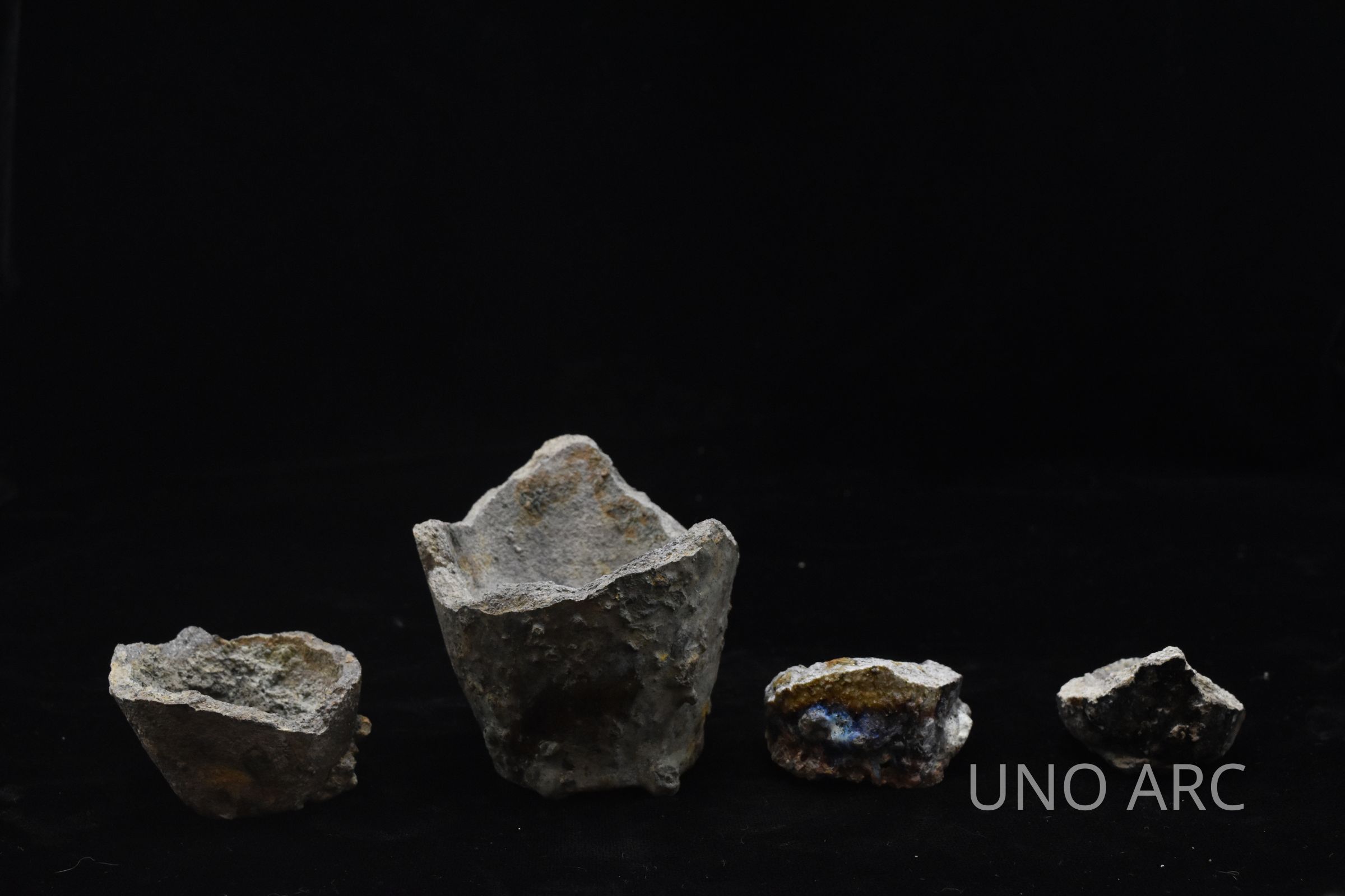 Crucible corrosion on the interior and exterior of the vessel, likely the result of molten lead or overheating.Created By