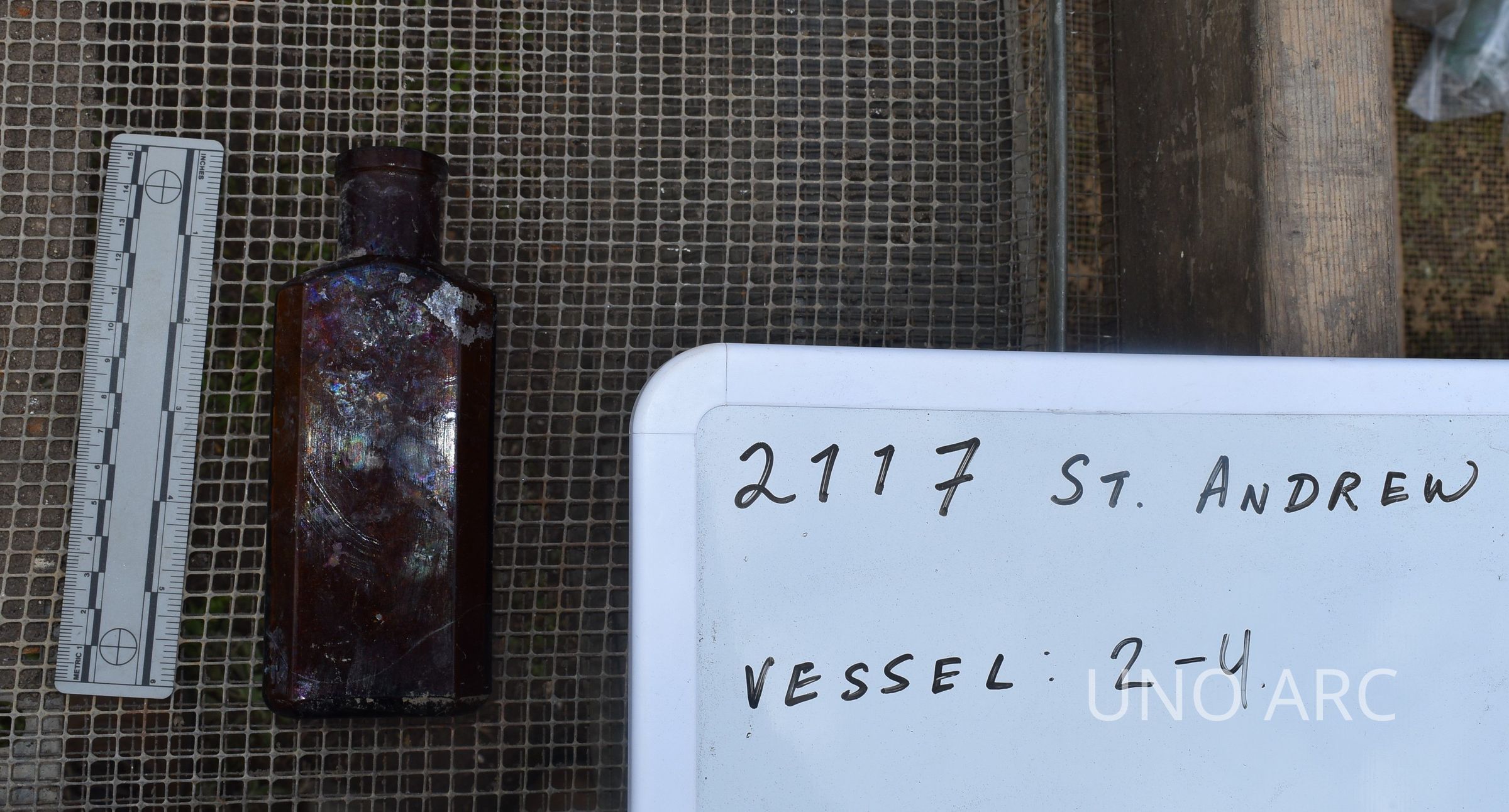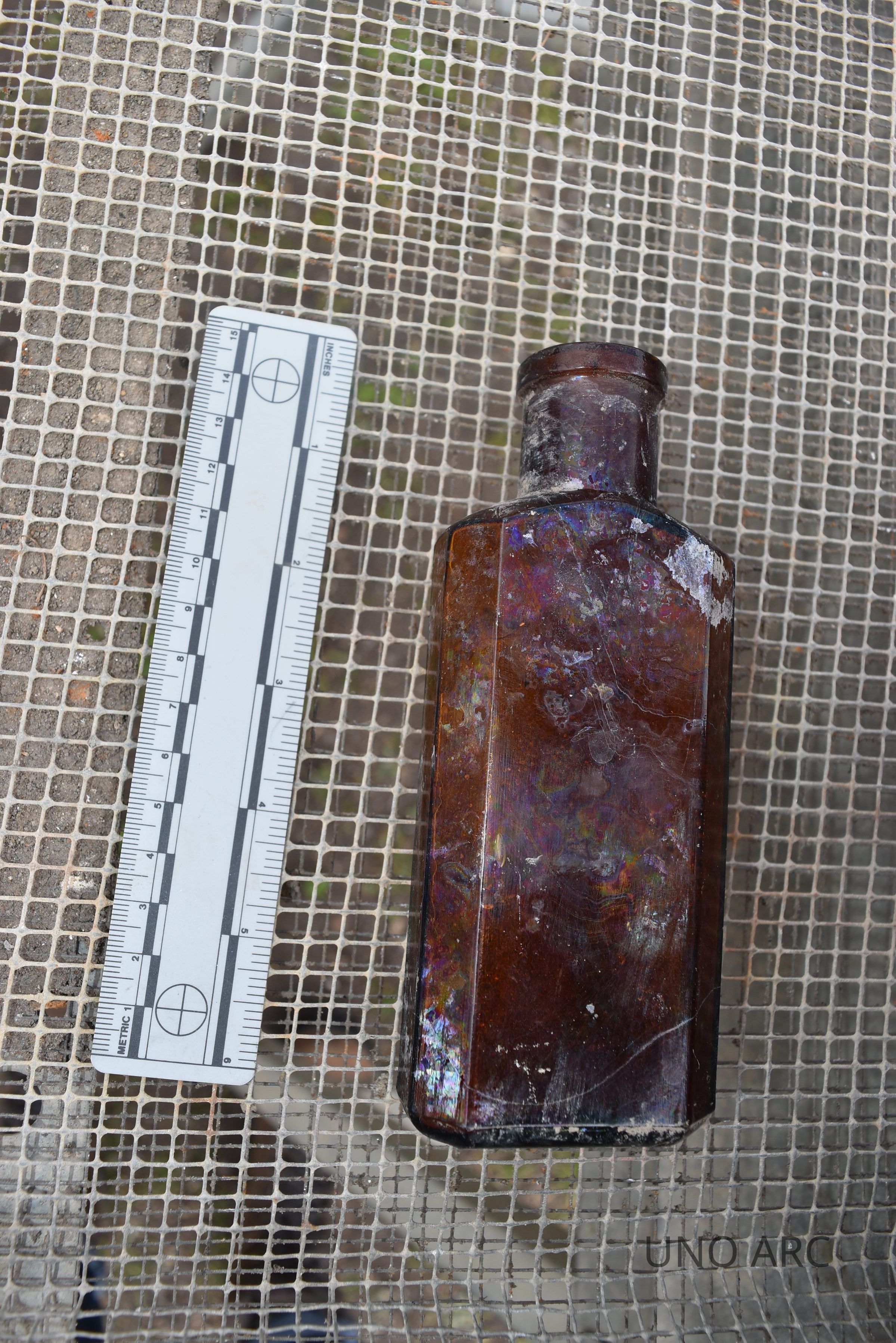 Mold blown amber bottle w/ "I" on baseContext