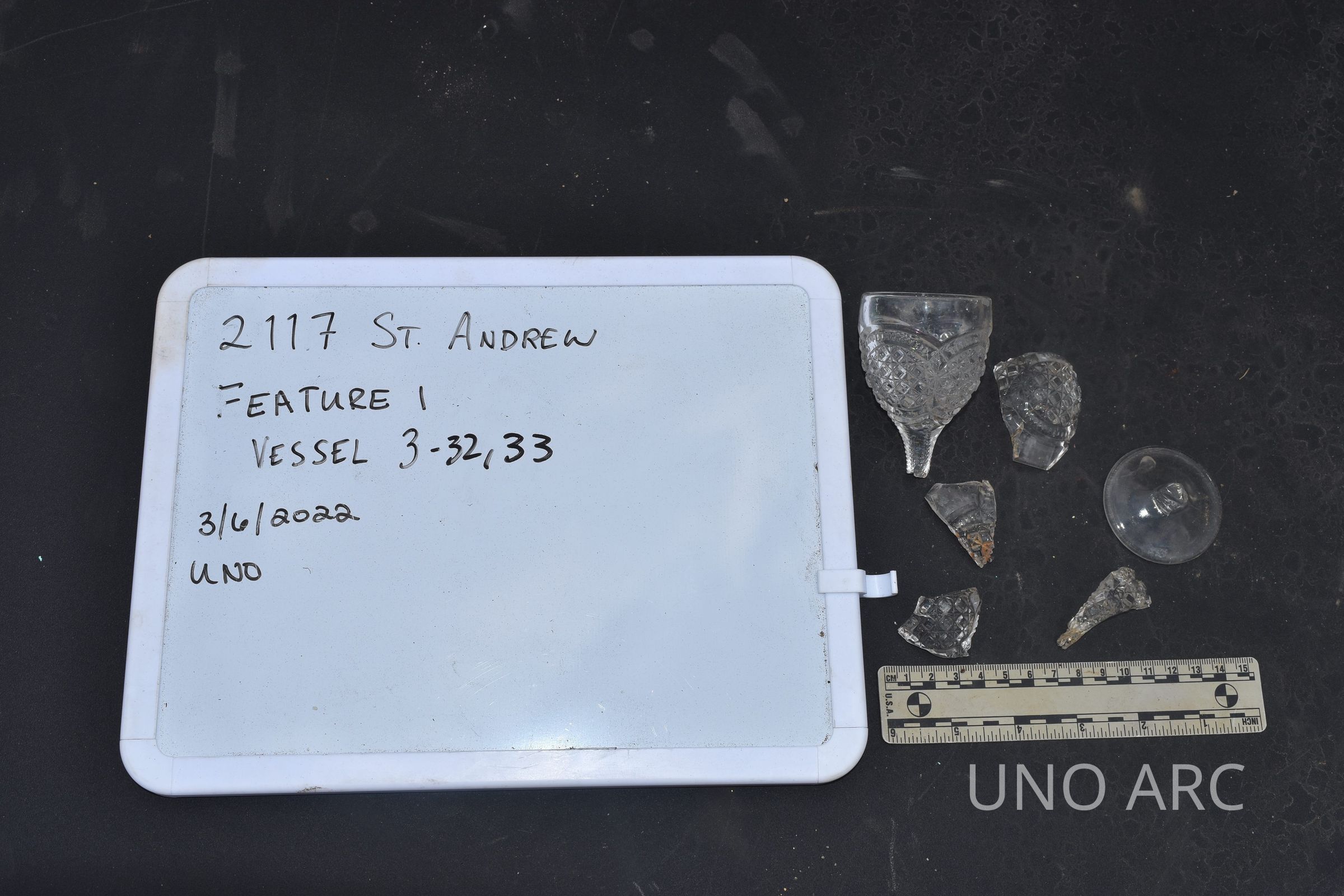 Colorless stemware with press molded miters and hobnails, prob. dessert glassContext