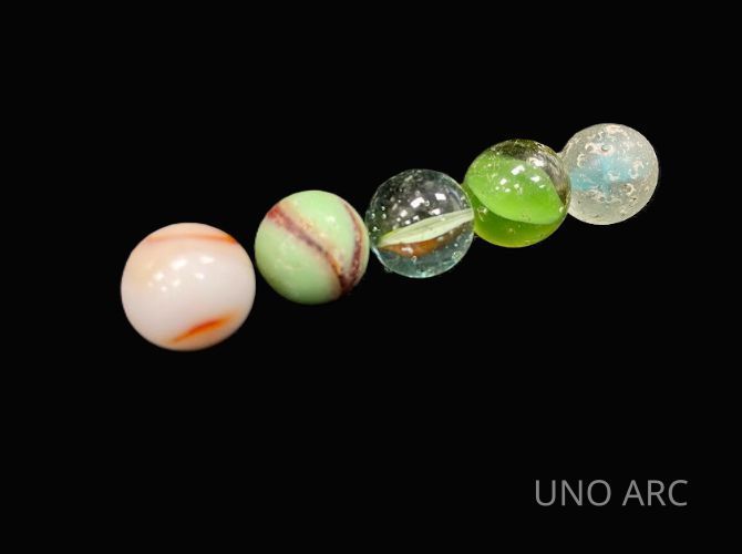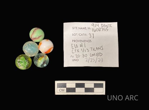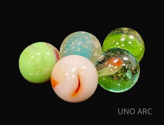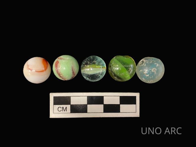 It if difficult to know if these five marbles are modern artifacts (although they show signs of wear_ or glass marbles that were brought over from Germany. The United States did not begin mass production of glass marbles until after the Civil War ended.