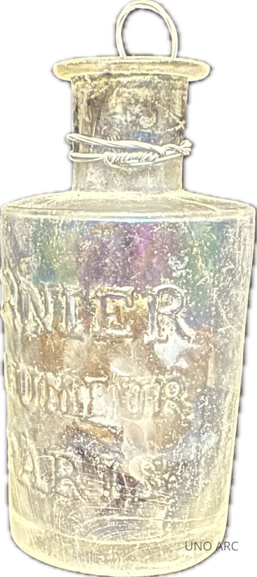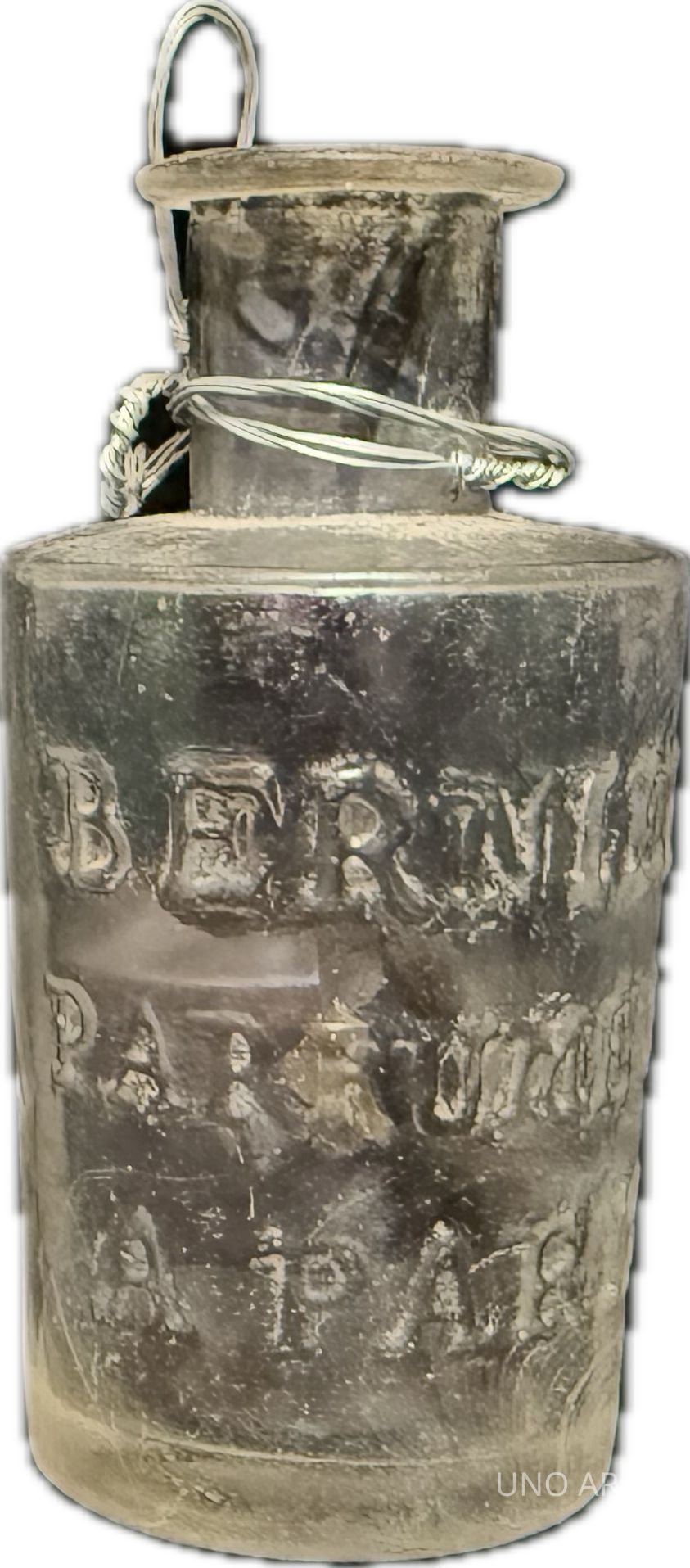 Colorless Corked Perfume Bottle; Label- "BERNIER/PARFUMEUR/A PARIS"; Wire Wrapped around the Neck of the Bottle; Cylindrical Tapered; Two Piece Mold; CompleteContext