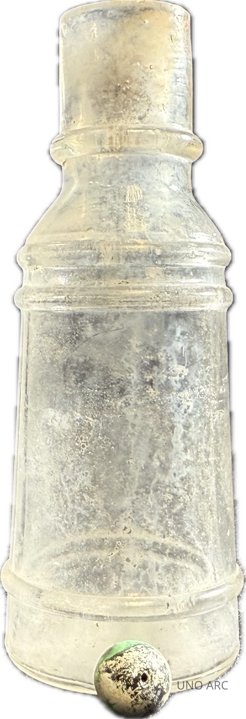 Colorless Bottle Filled with 2 Marbles [Clay: 1 Undecorated Clay Marble, 1 Decorative Green and Black Smaller Marble]; Tapered Ribbed Shape; Two Piece MoldUse