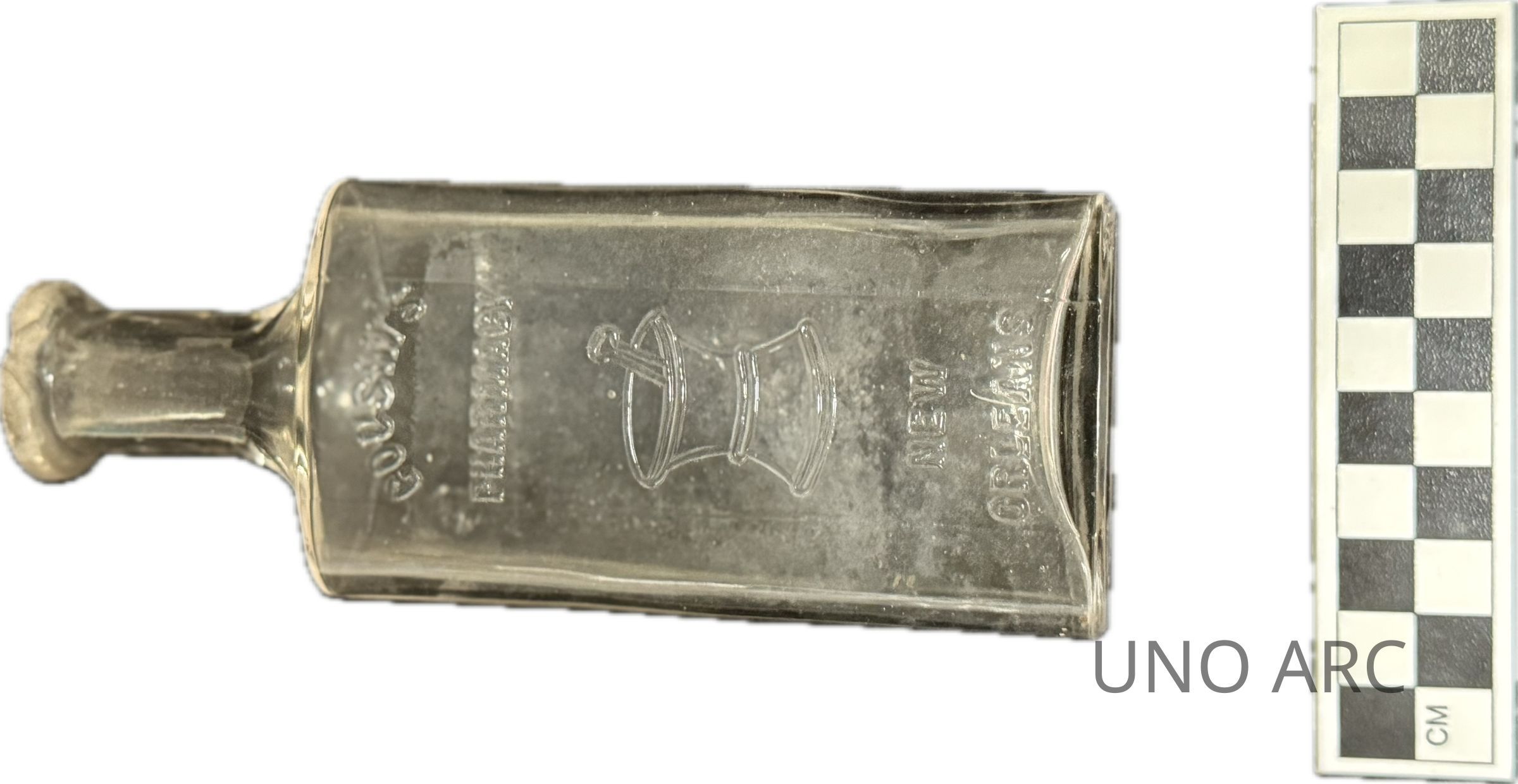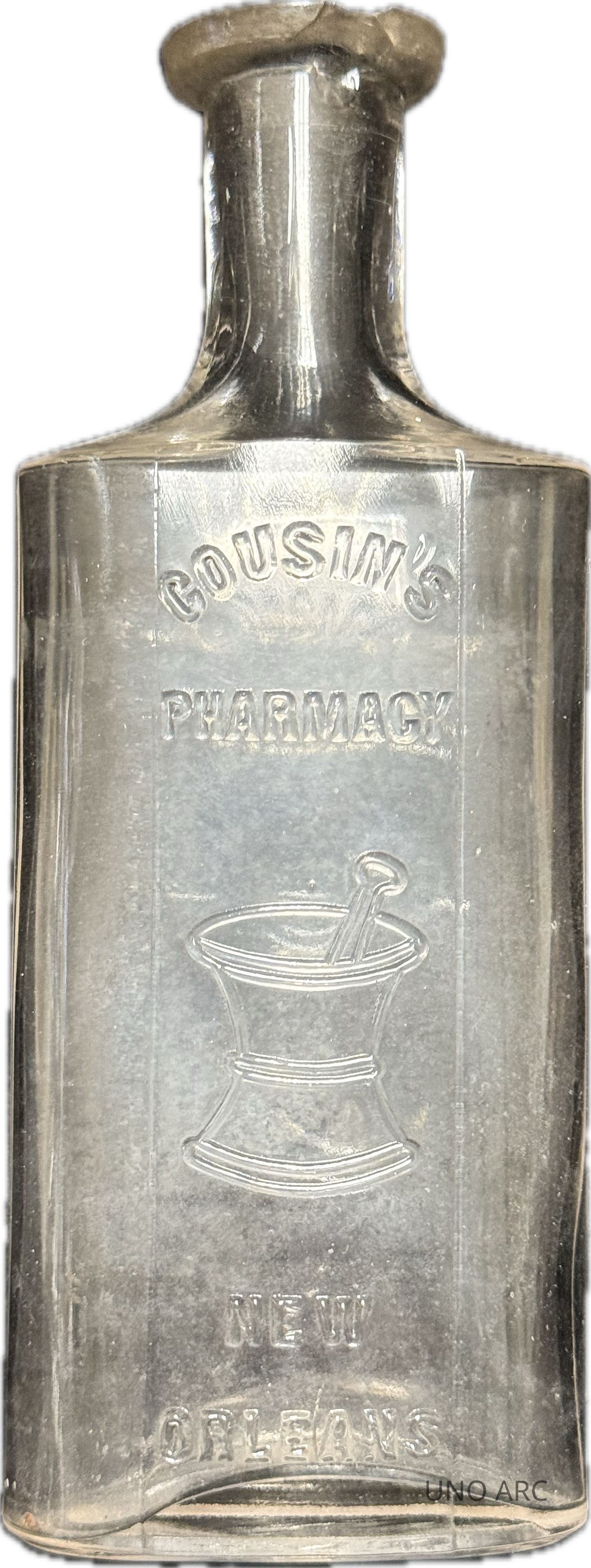 Colorless Medicine Bottle; Ovoid Straight Shape; Two Piece Mold, Embossed Label: COUSIN'S PHARMACY/ NEW ORLEANSContext