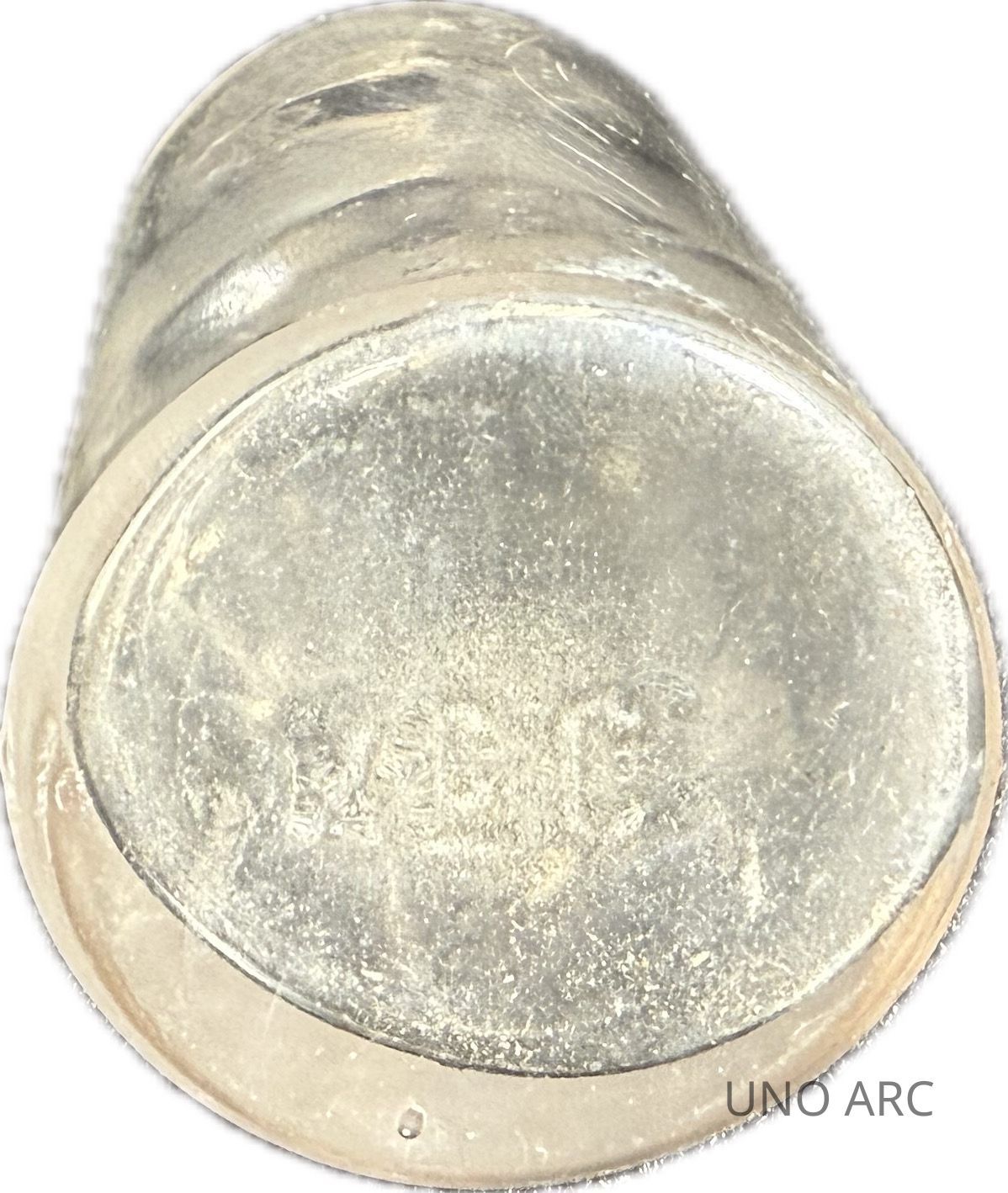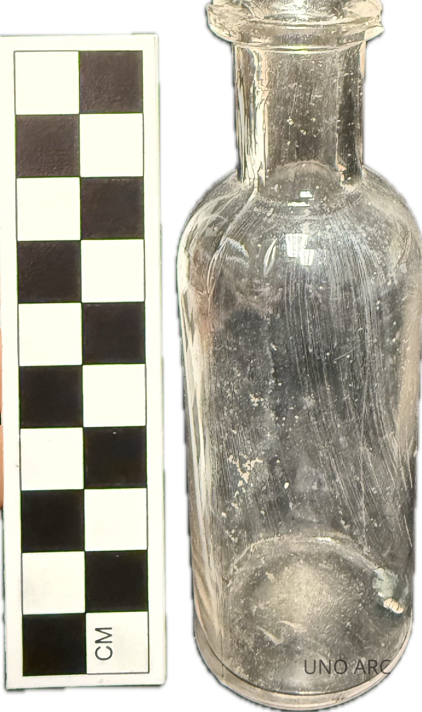 Colorless Medicine Bottle; Circular Straight, Two Piece Mold; Makers Mark (McC/3:8); Complete; Chipped Lip; Ca. 1870-1880Context