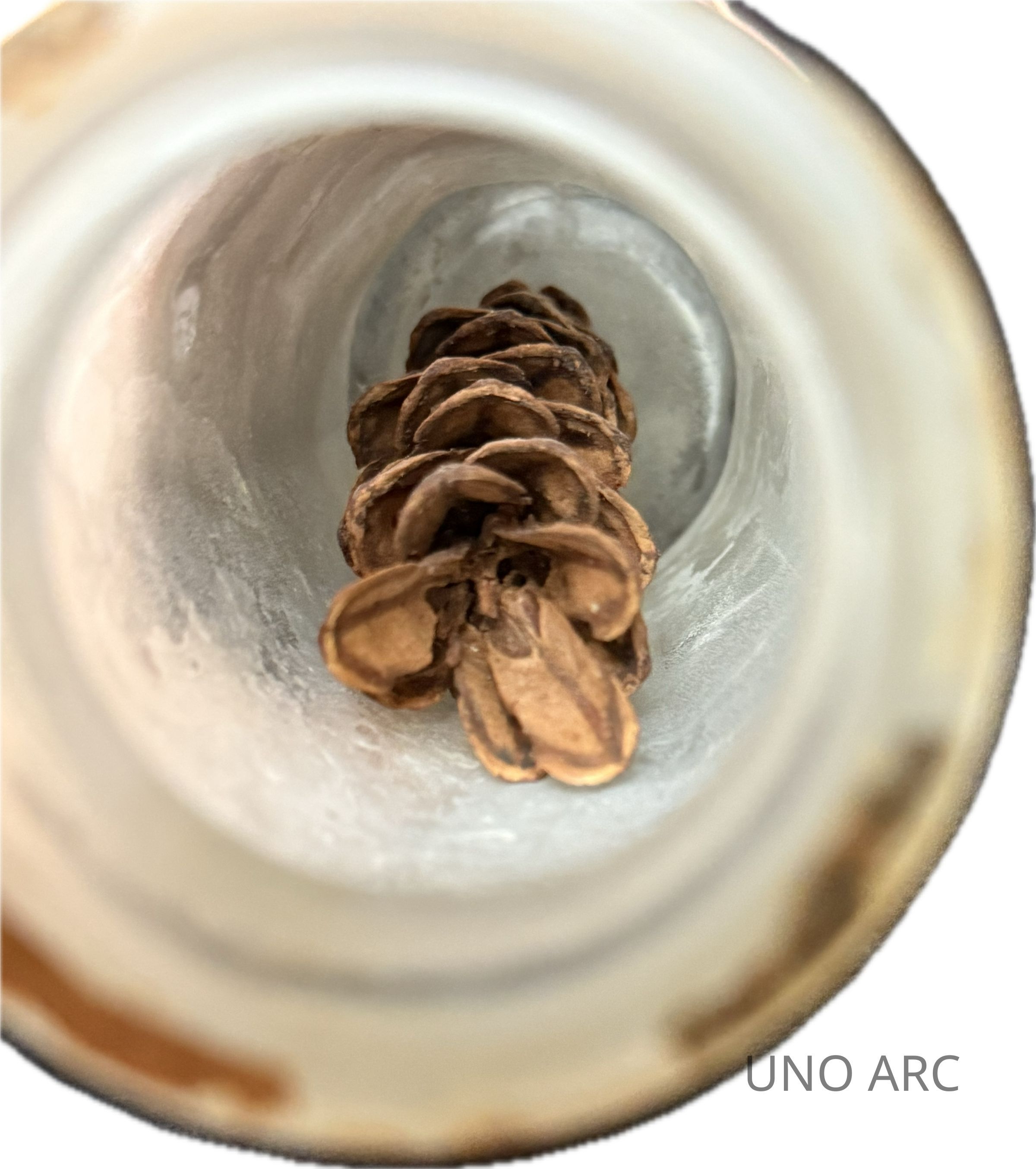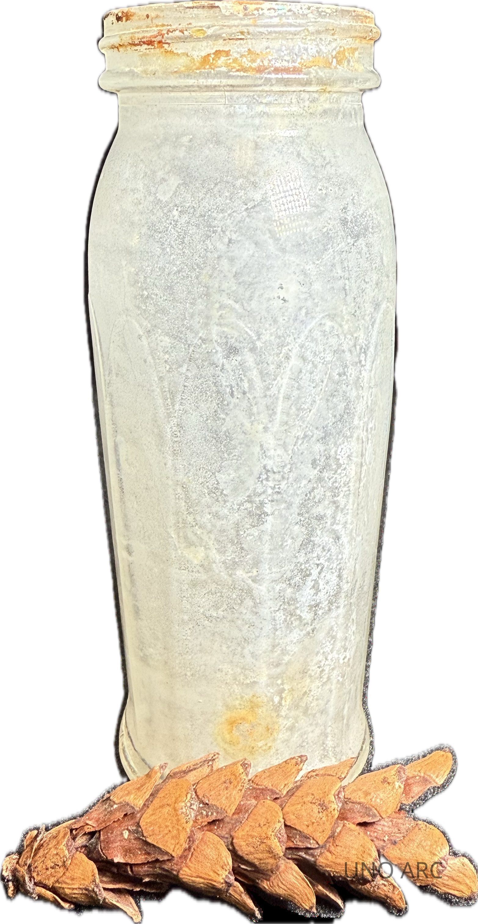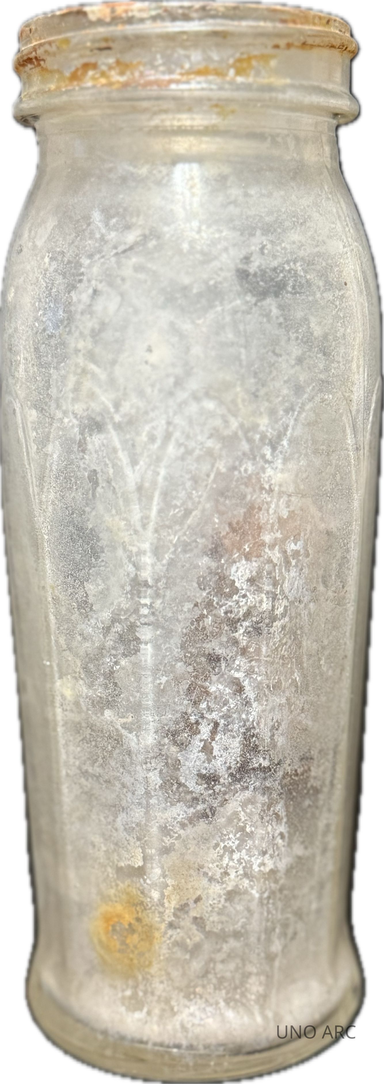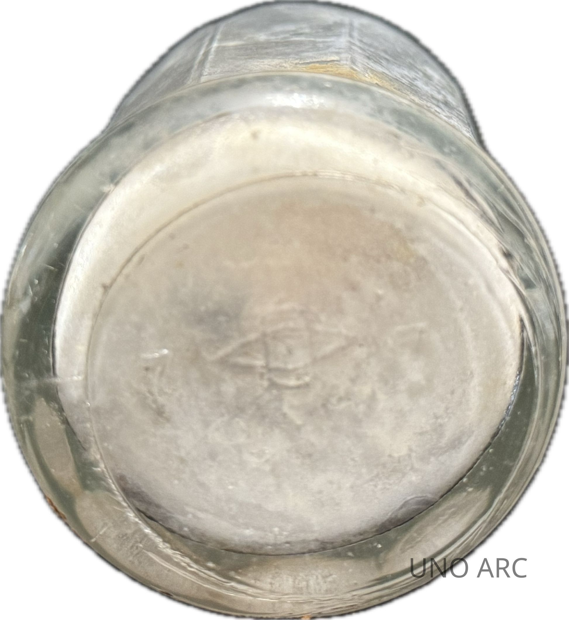 Colorless Condiment Bottle; Circular Tapered Shape; Machine Manufactured; Panels; Maker's Mark: Owen-Illinois M.M. 7 [Owen-Illinois Maker's Mark]; Complete; Screw Finish, Partial Pinecone Inside; 1937Use