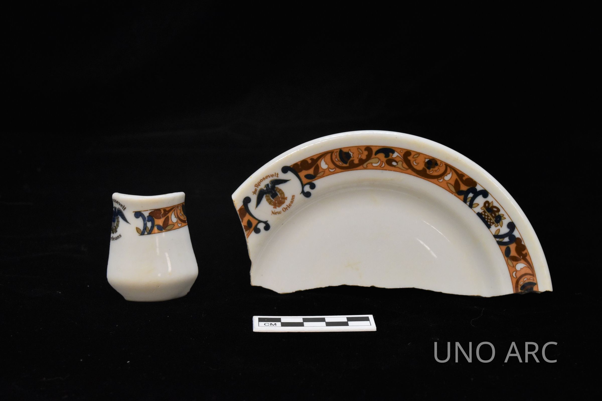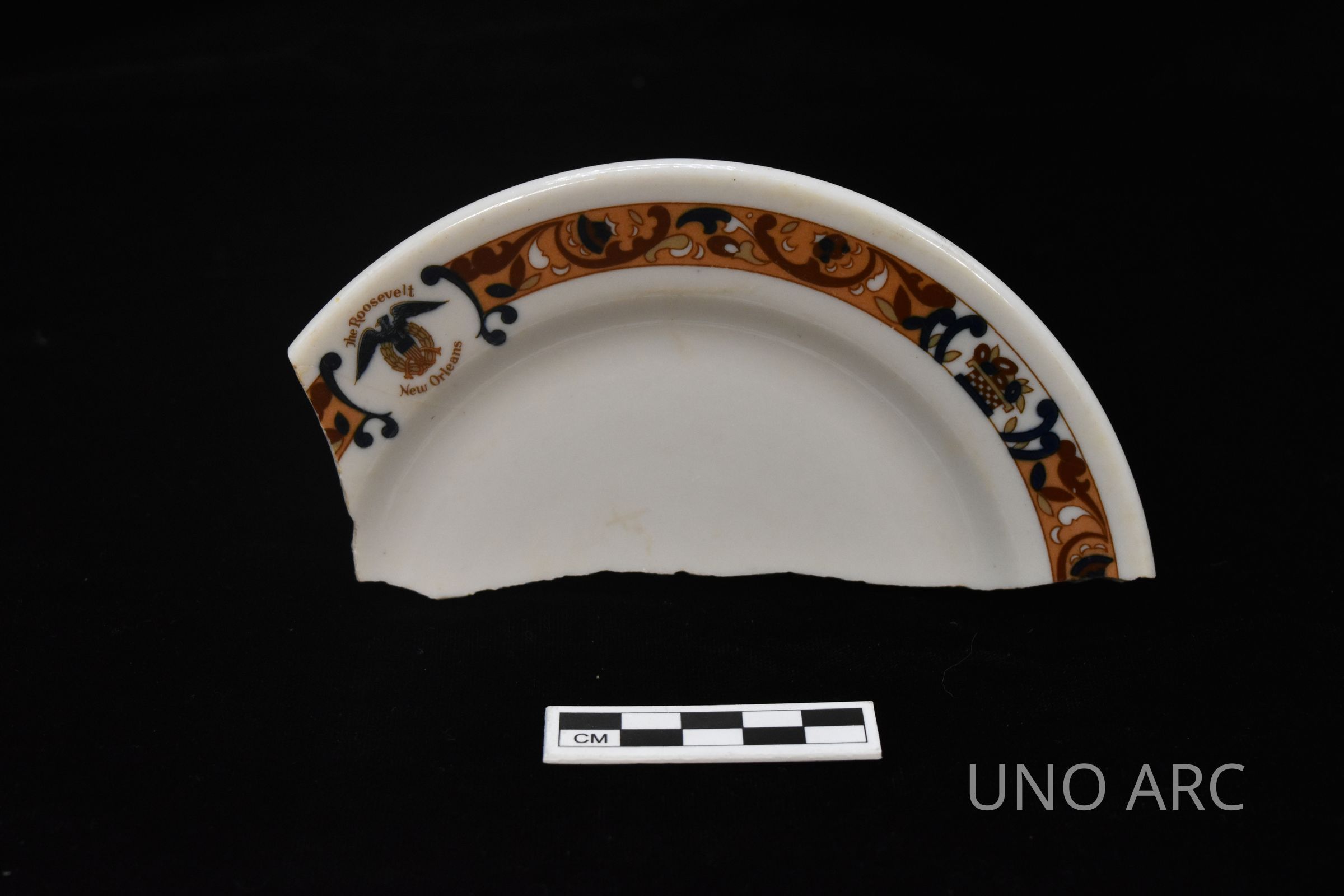Ceramic hotelware from the Roosevelt New Orleans. The pattern from this plate sherd matches the pattern from another vessel sherd in this collection.Created By