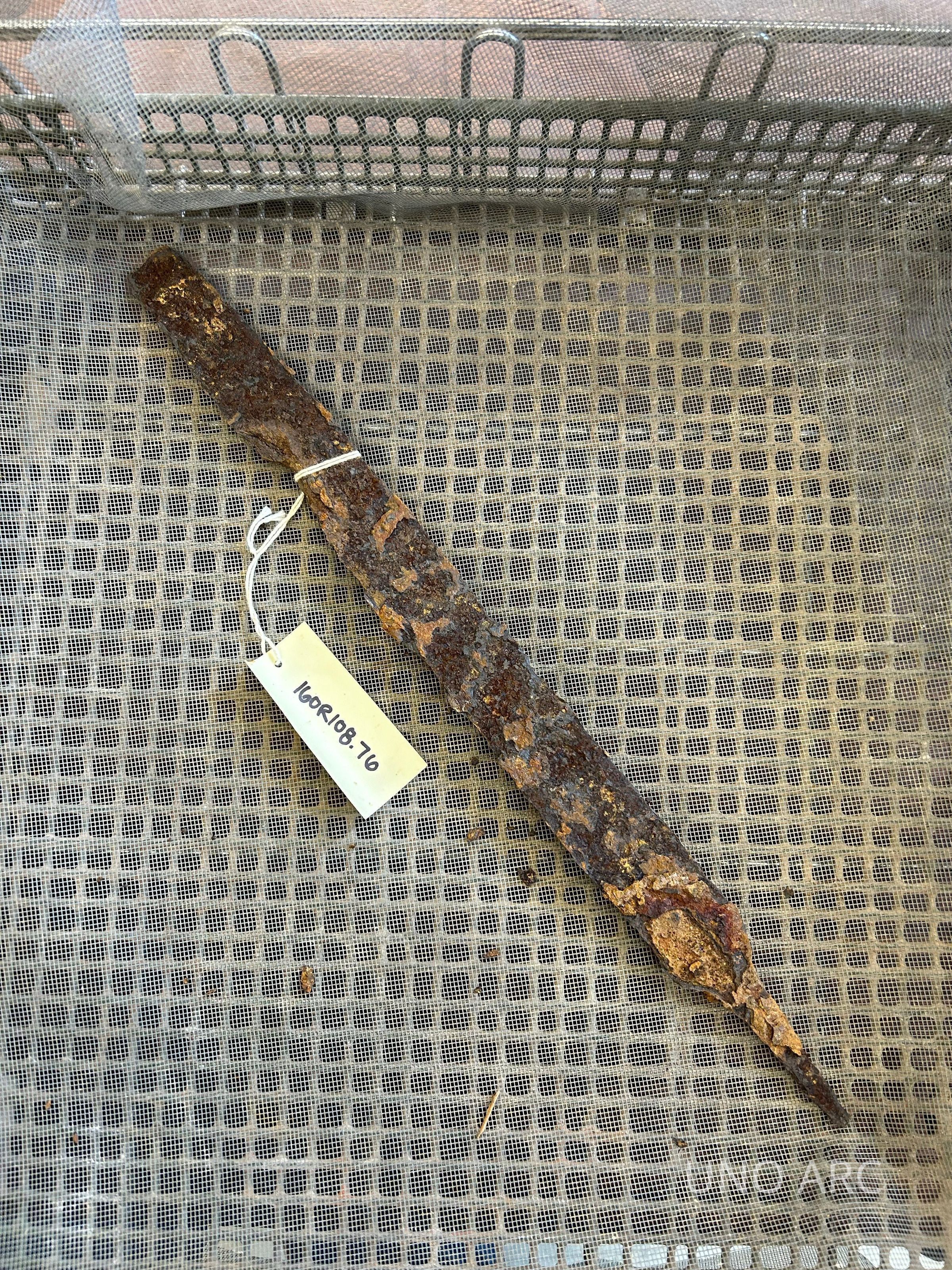 Iron, flat on one side and curved on the other. Pointed on one endContext