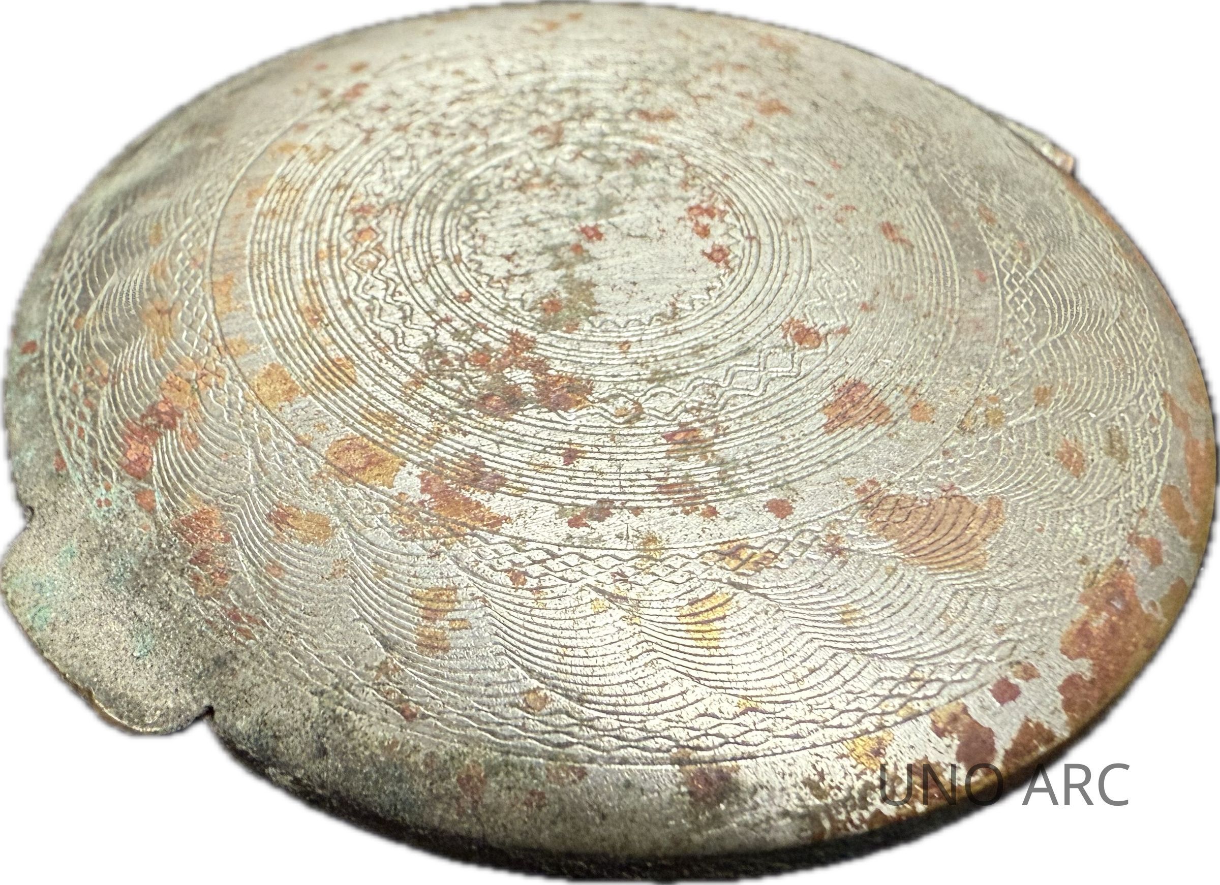 Silver Plated Piece of a Makeup Mirror (or Pallete); Circular Ornamental Engravings on Interior and Exterior; Broken Hinge and Lip on Opposite Edges; Reflective Material on InteriorContext