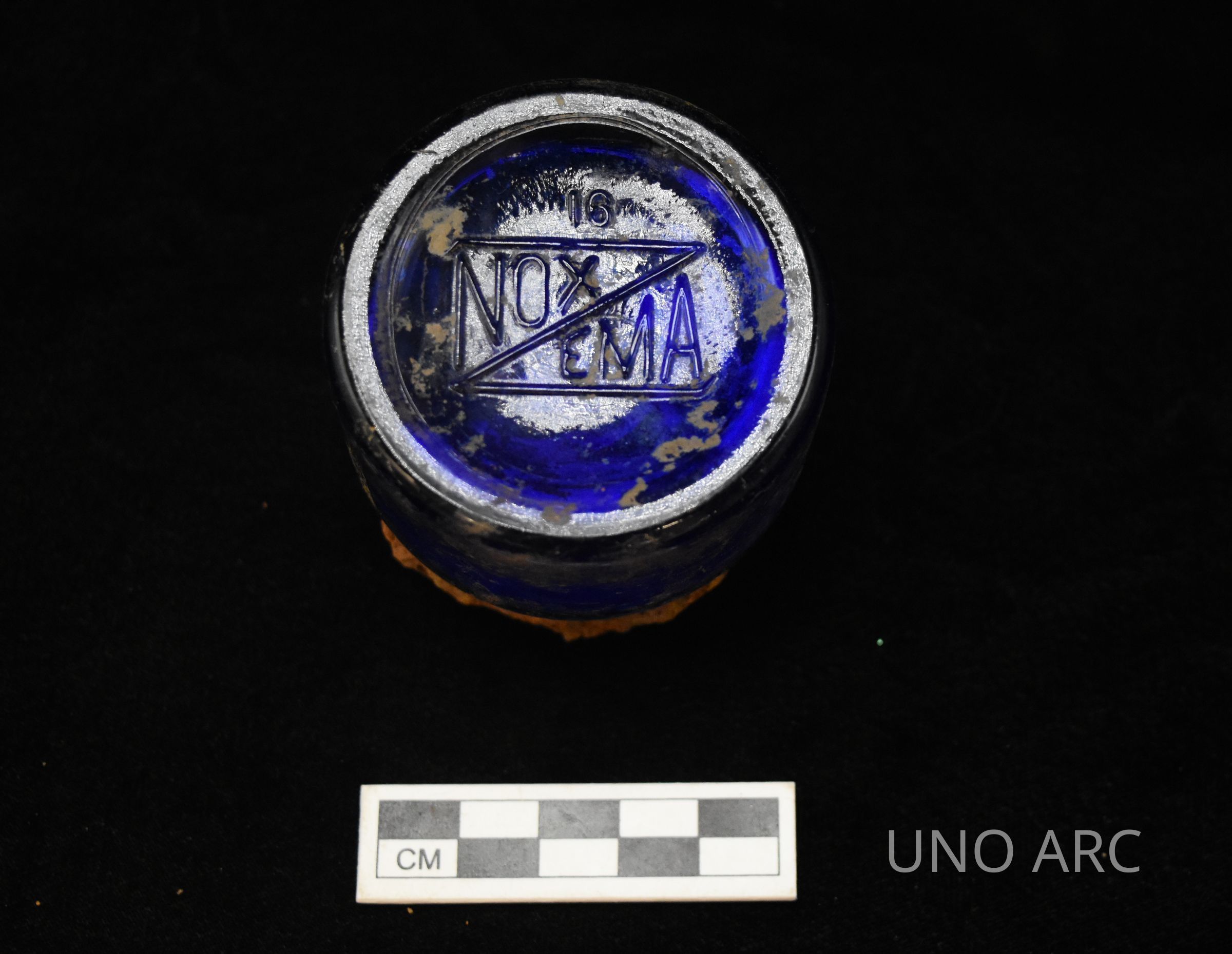 This is a Noxzema face cleanser jar that was most likely manufactured between 1940 and 1950. The jar is cobalt blue glass with a wide-mount ferrous screw cap. Embossing on the bottom of the jar reads "NOXZEMA" in the brand's stylized logo.Created By
