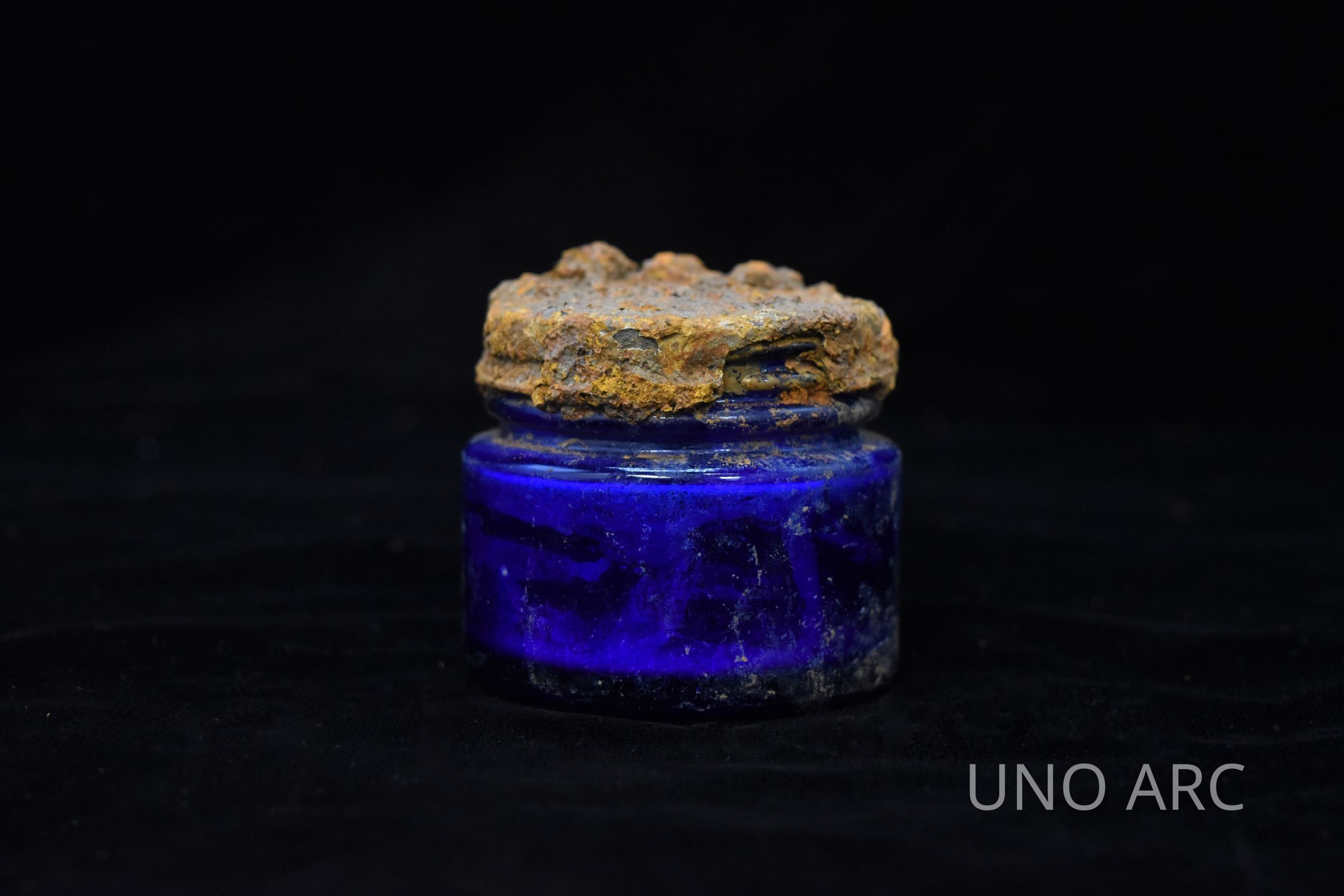 Glass, Temple of the Innocent Blood, household object, beauty product, colbalt, wide mouth screw cap, jar, noxzemaDescription