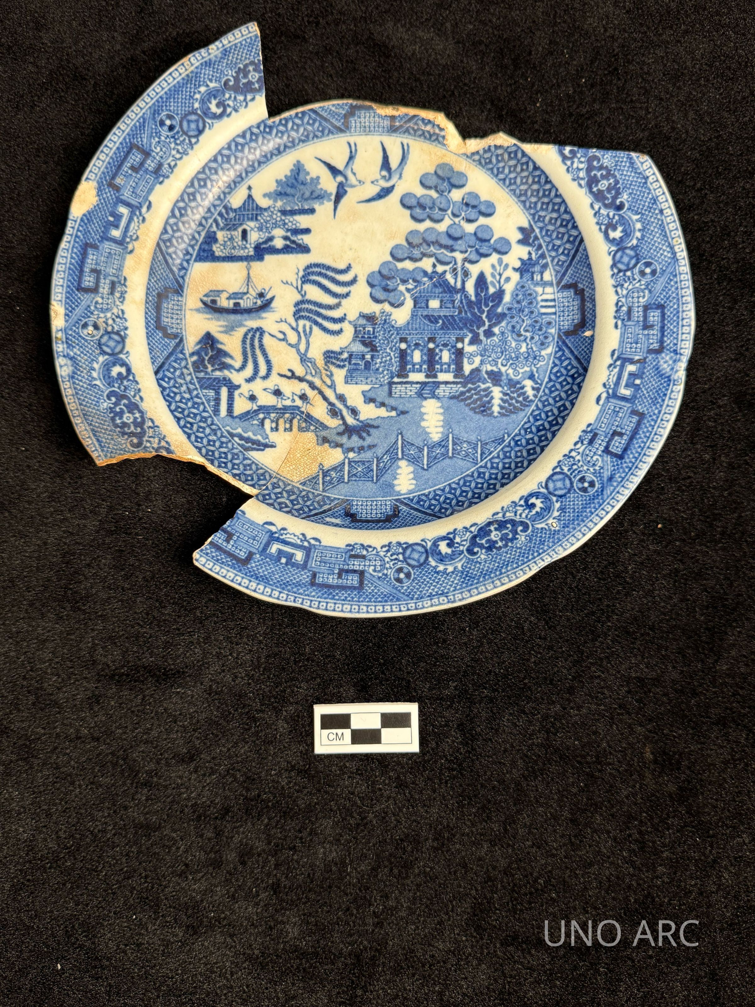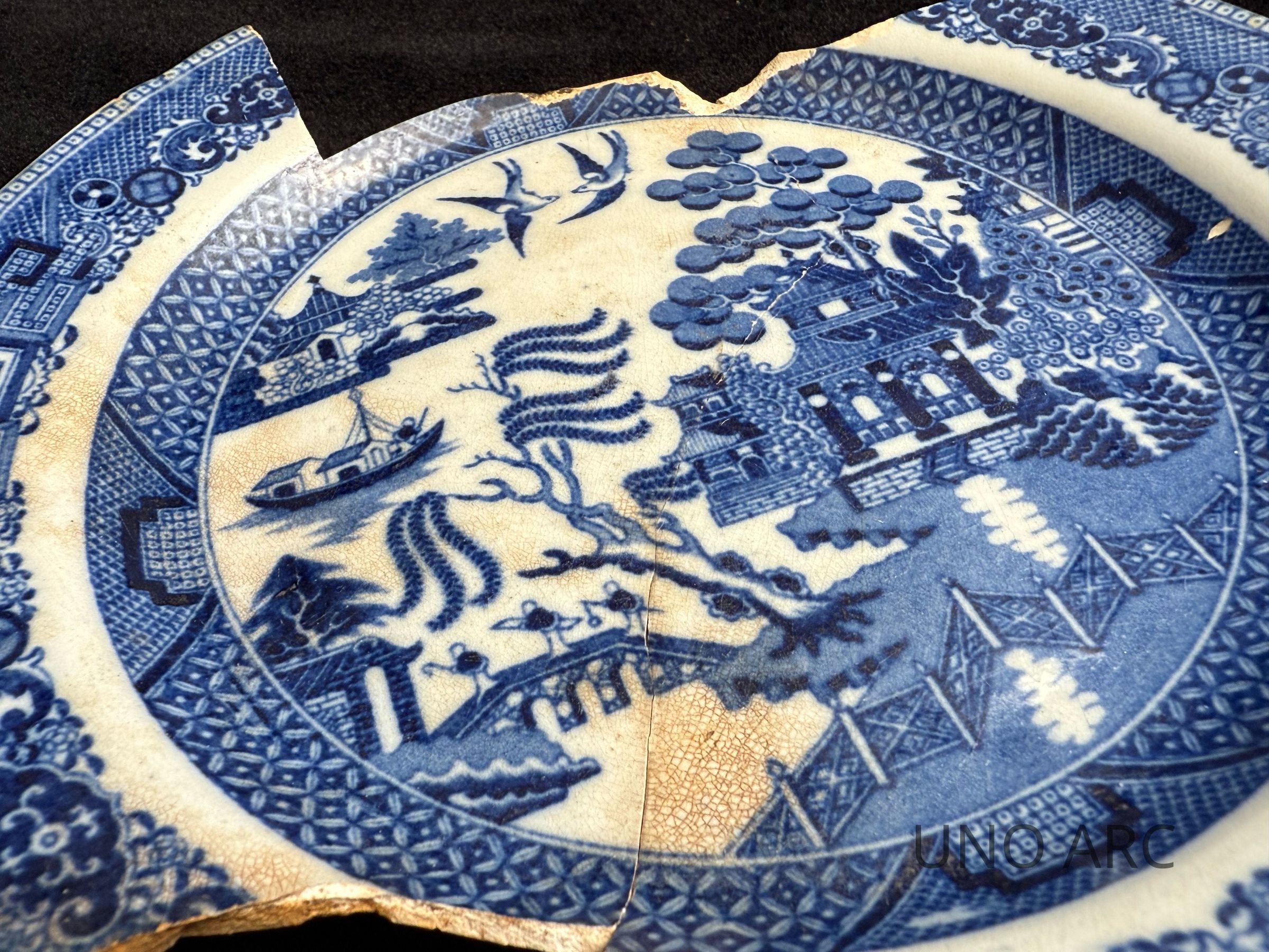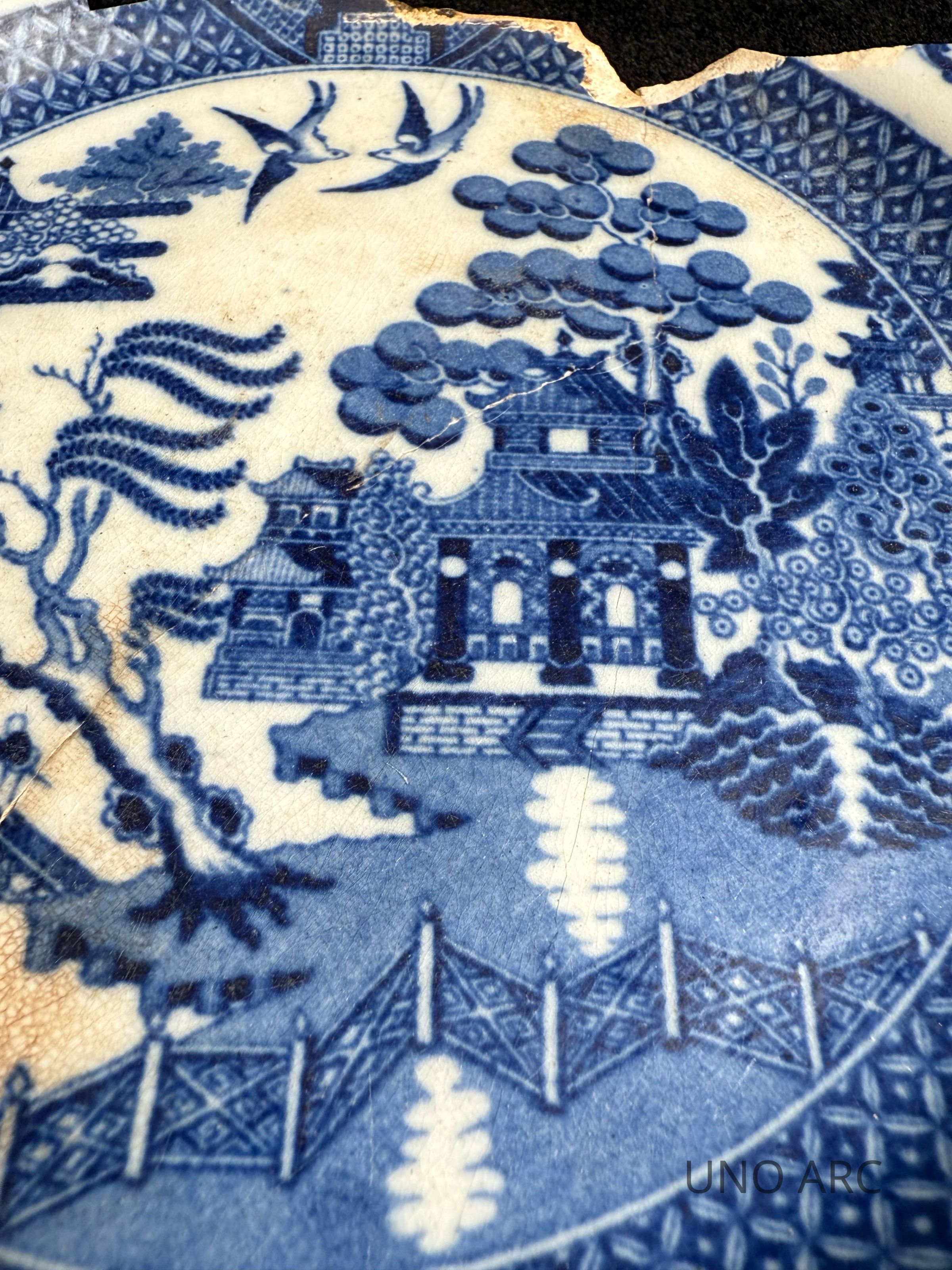 Blue transfer-print plate featuring the Willow pattern designCreated By