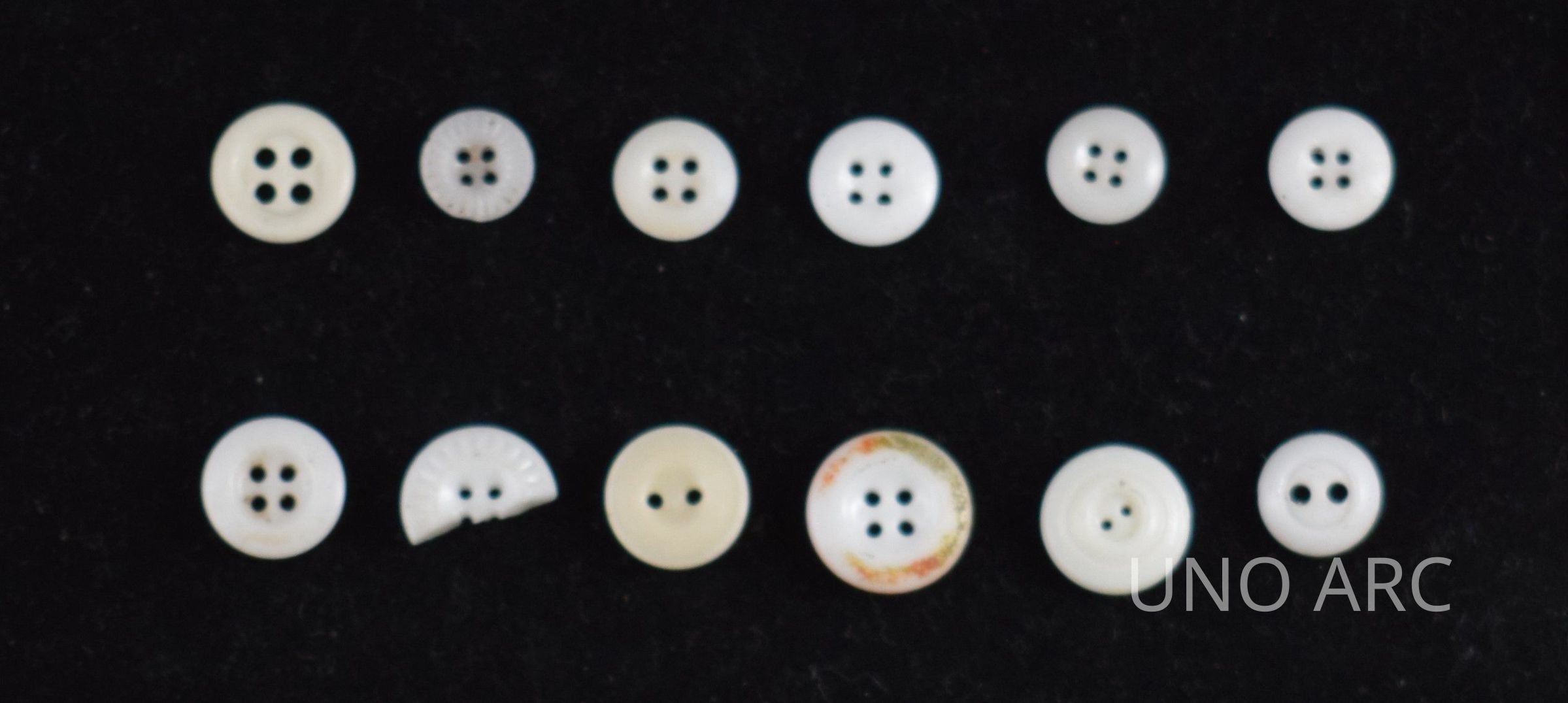 White Prosser-type porcelain buttons. Nine four-hole sew-through buttons. Three two-hole sew-through buttons.Context