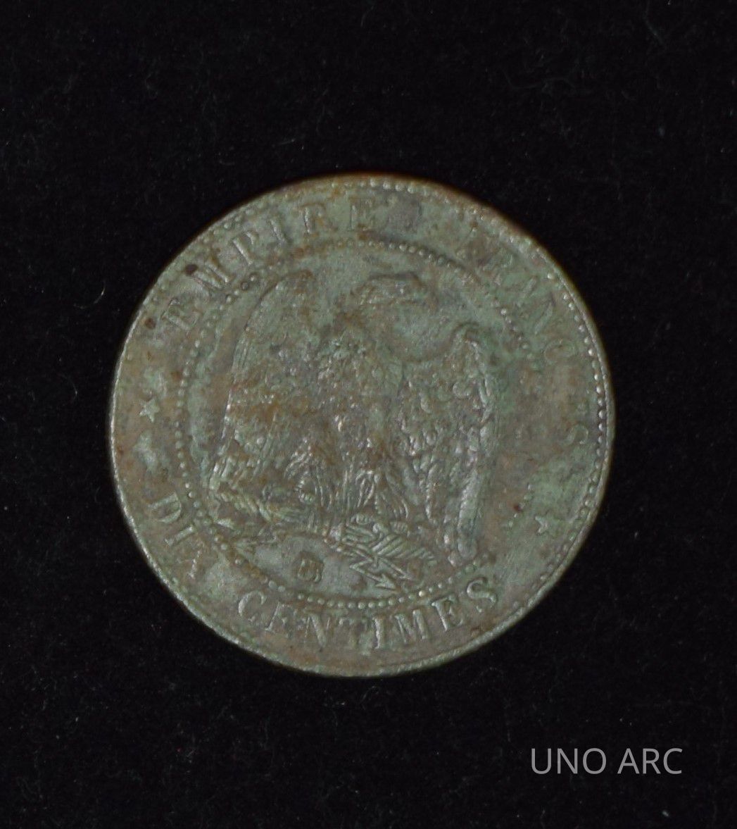 Eagle facing right inside dotted circle with lettering around outer edge. Marked with “EMPIRE FRANCAIS…/DIX CENTIMES”Context
