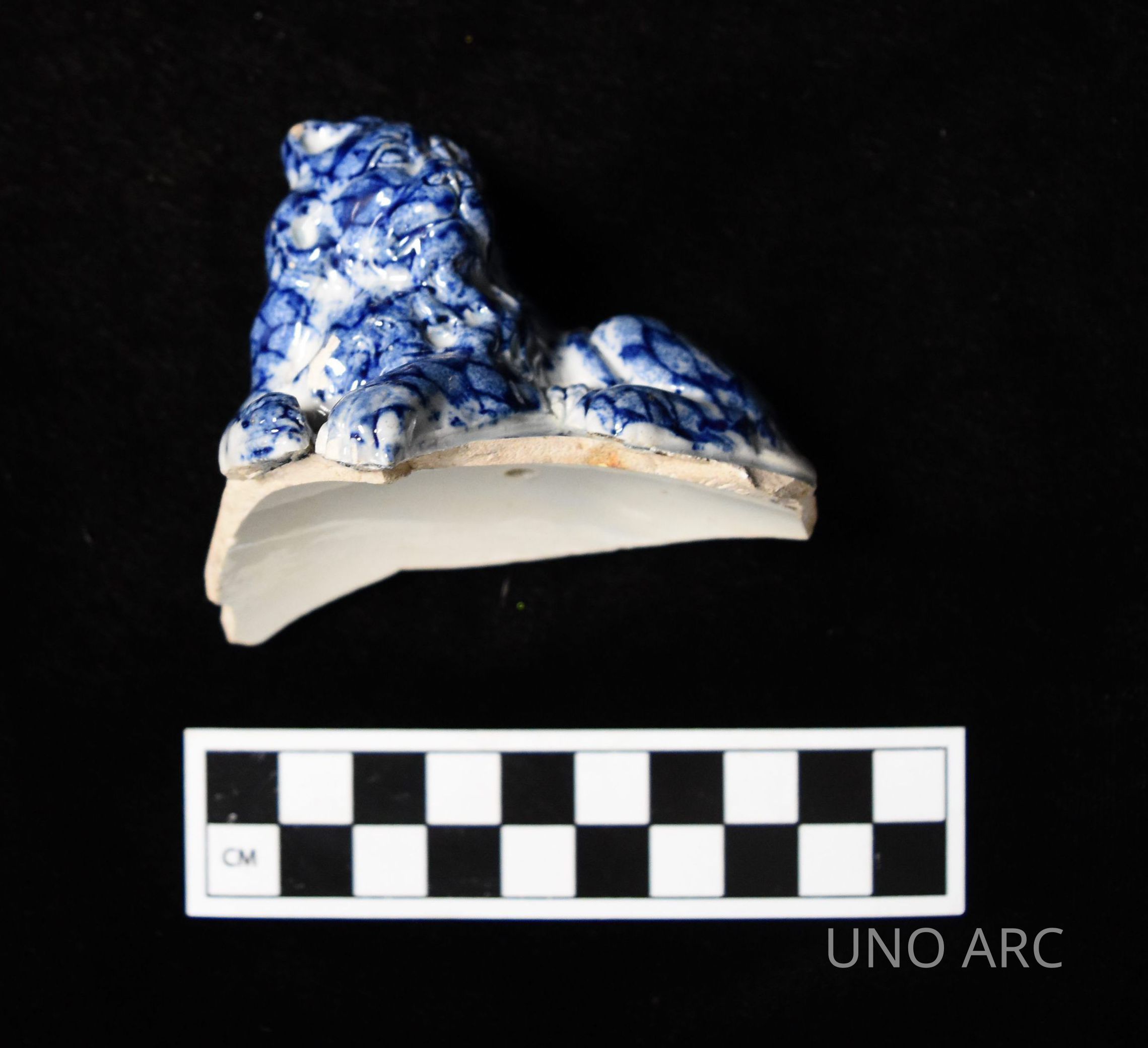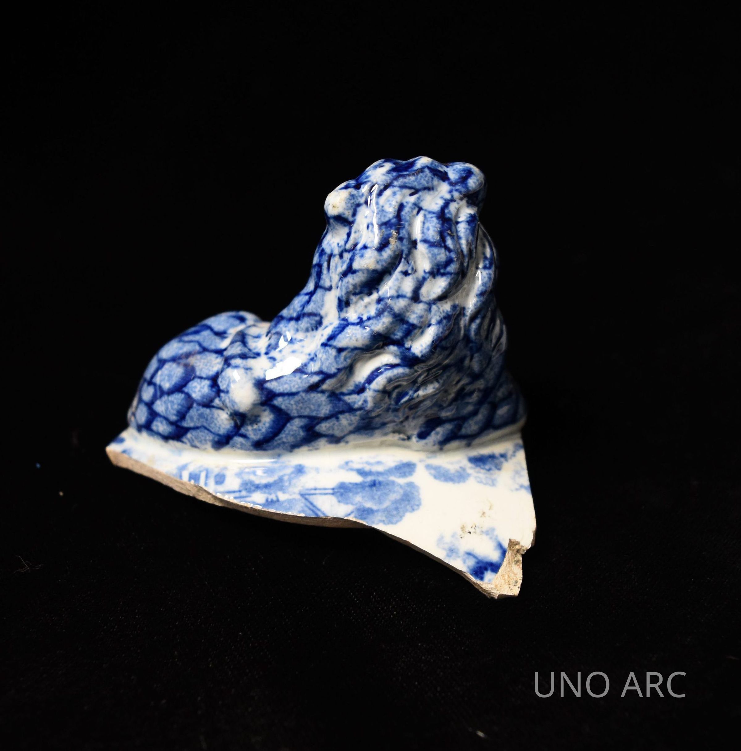 Blue transferprinted, white ware, lion-shaped pot lid handle. 1820- 1830s, Staffordshire, England.Context