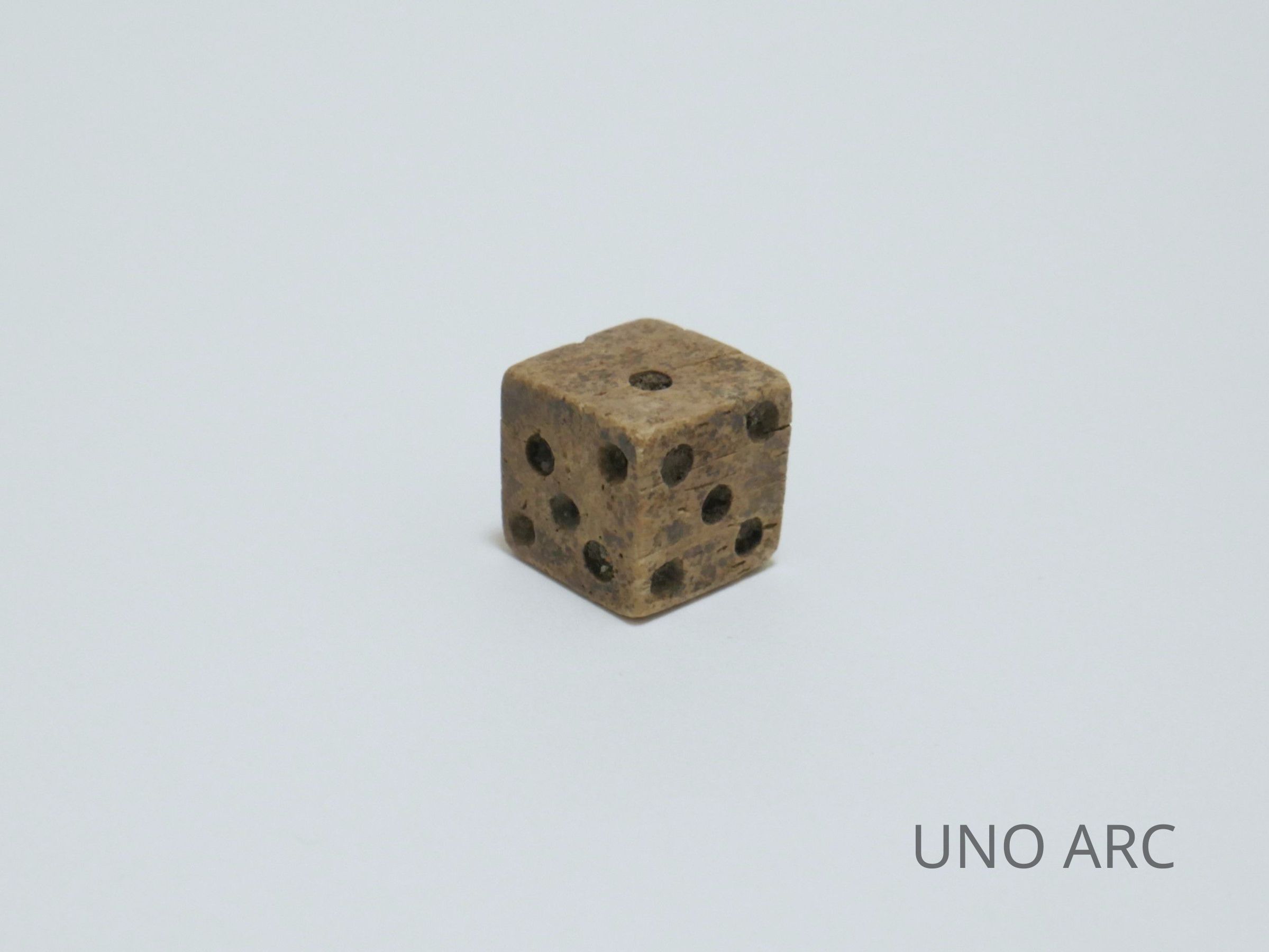 Animal bone "trick die" with four sides of 5, one side of 1, and one side of 6Context