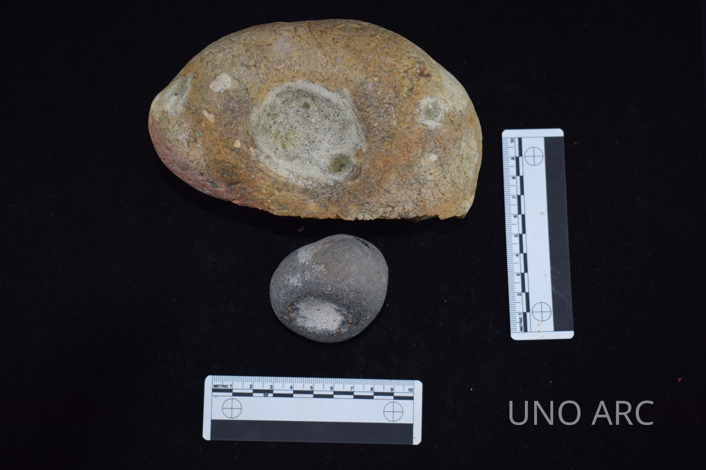 These stones are referred to as “nutting stones” in Indigenous America. They are used to break open hard-shelled nuts that are not able to be cracked with teeth. The nut would be placed in the depression and would be hit with a “hammer stone”.