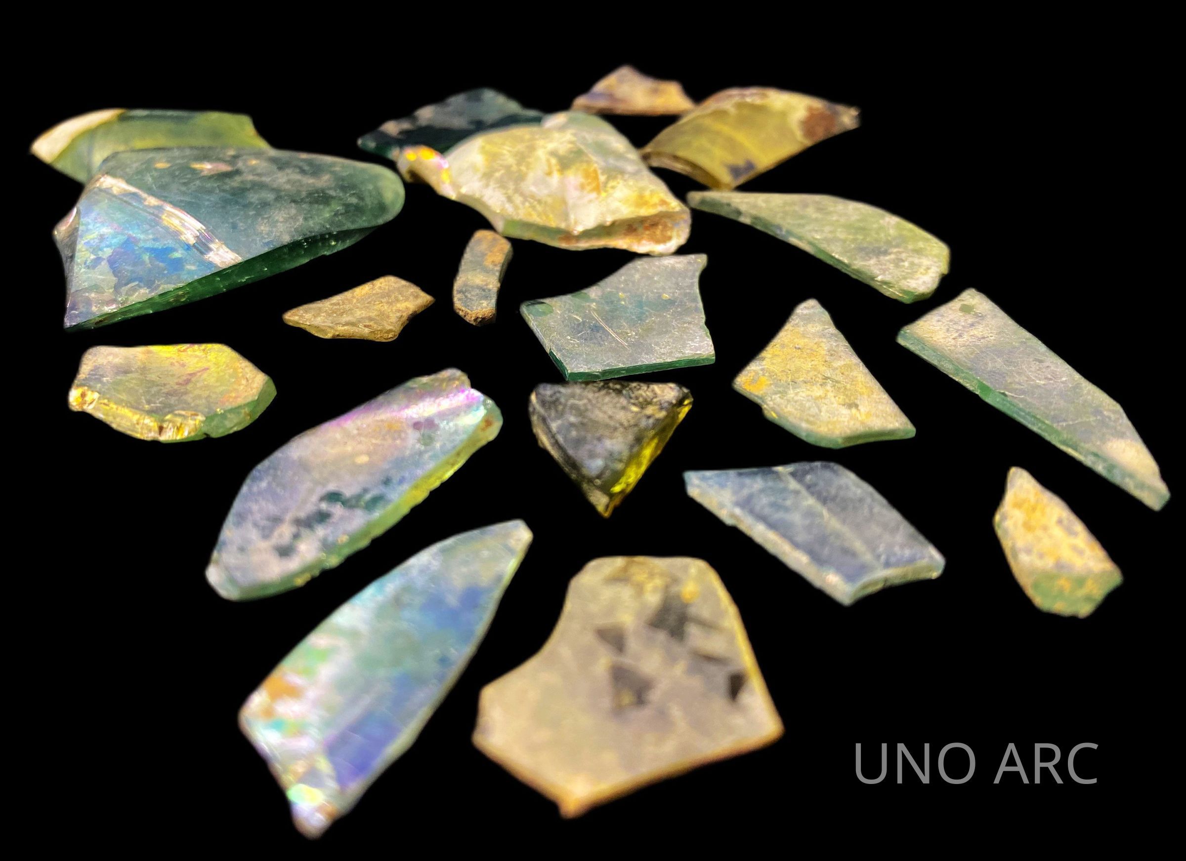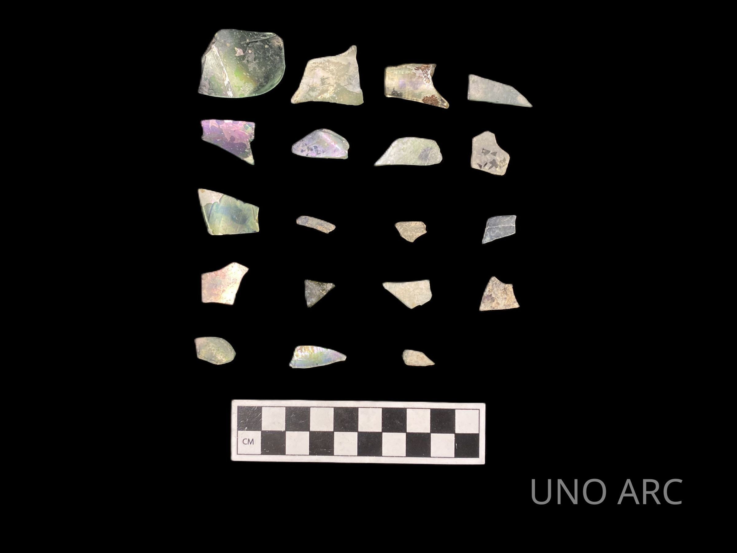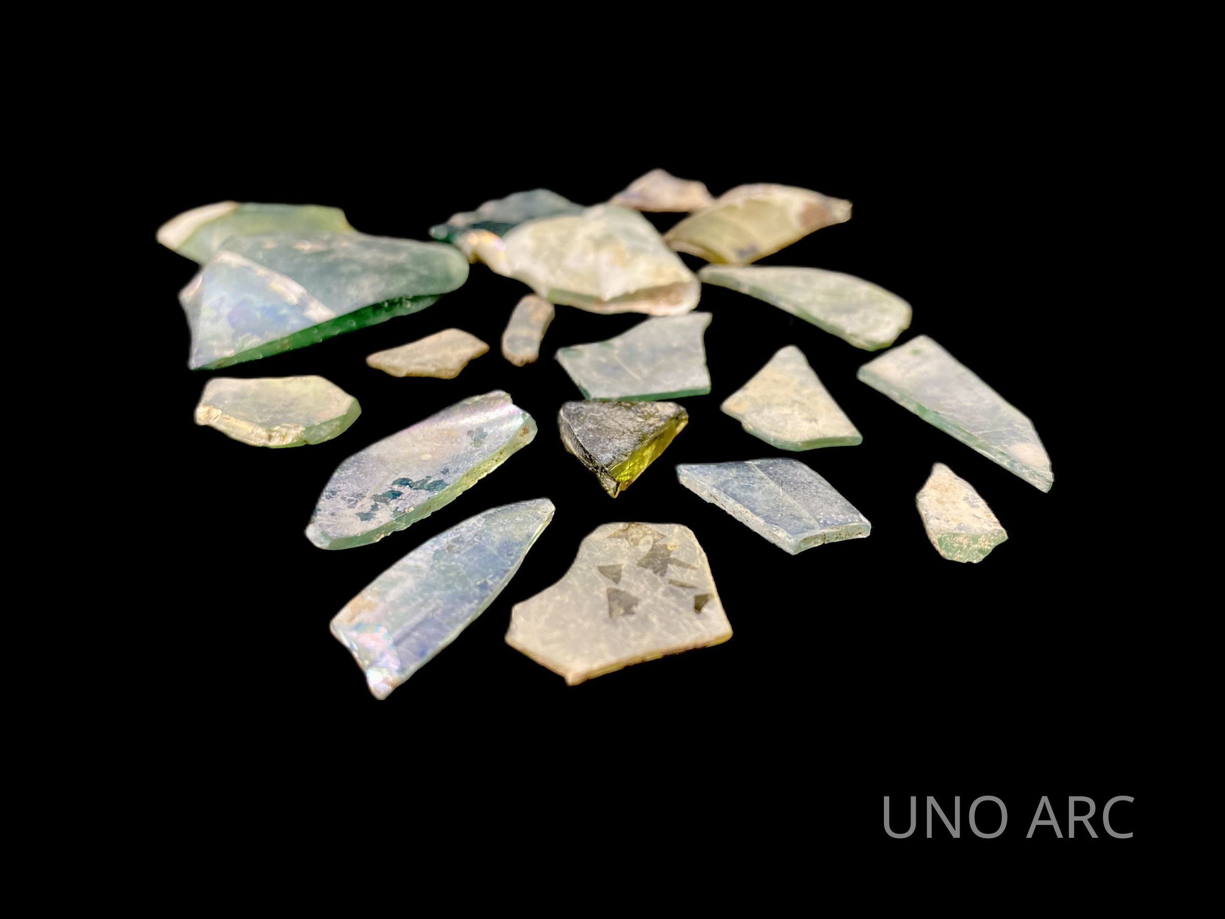 Assortment of glass fragments found with a small screen after initial screening.Created By