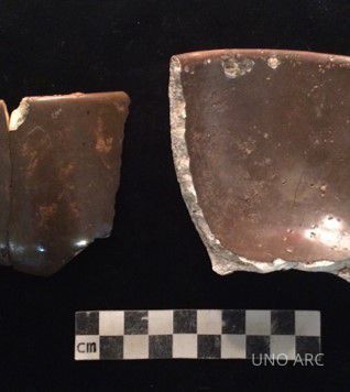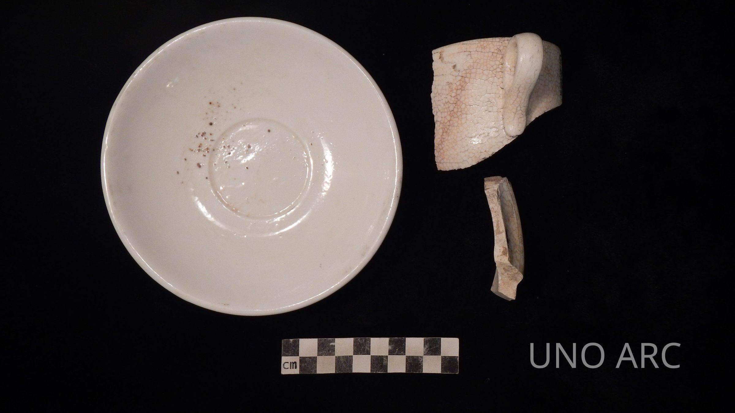 Whtie-bodied refined earthenware that appears distressed or damaged by production.