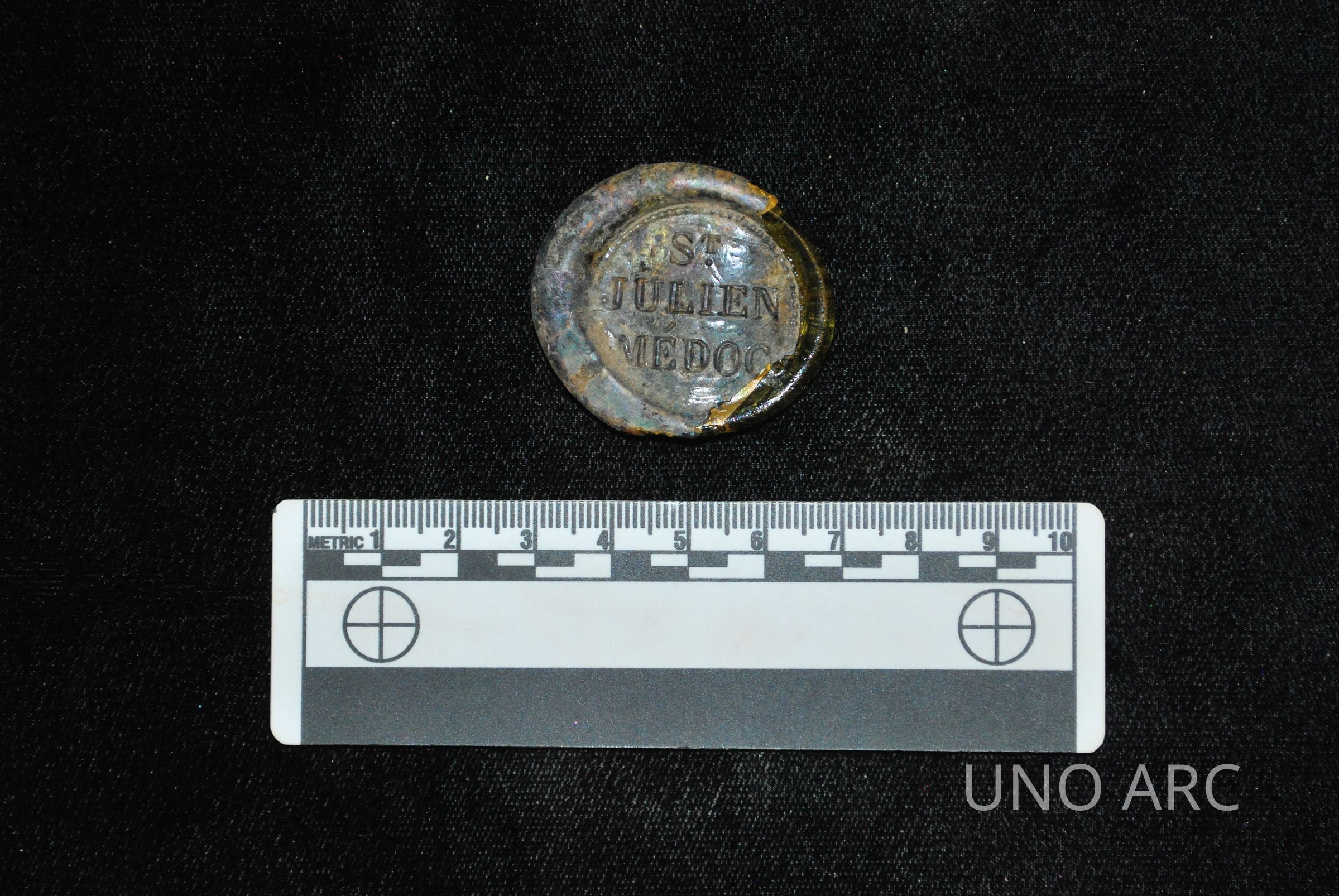 Glass wine seal embossed, "ST JULIEN MÉDOC", a common find on antebellum sites from New Orleans.Created By