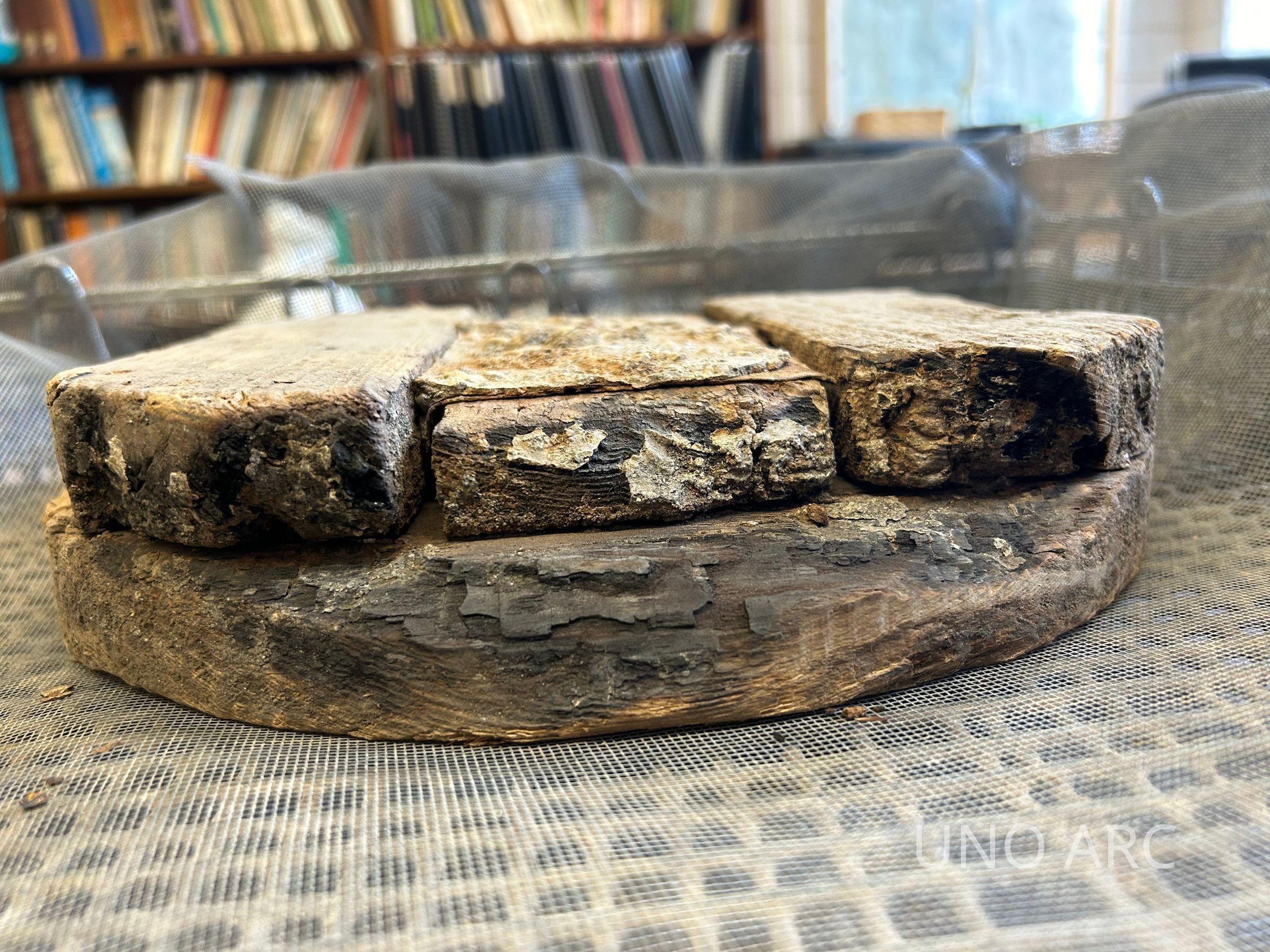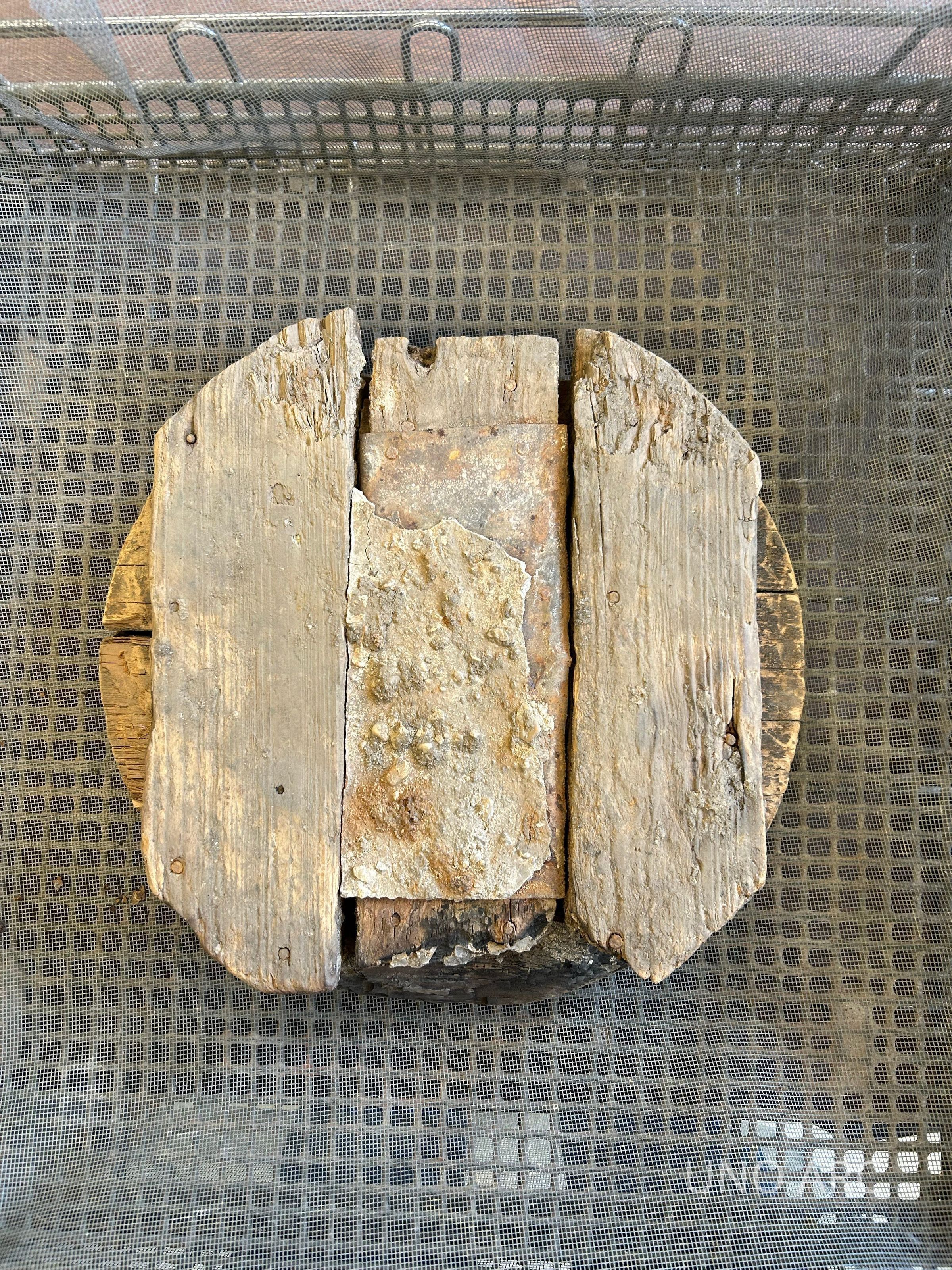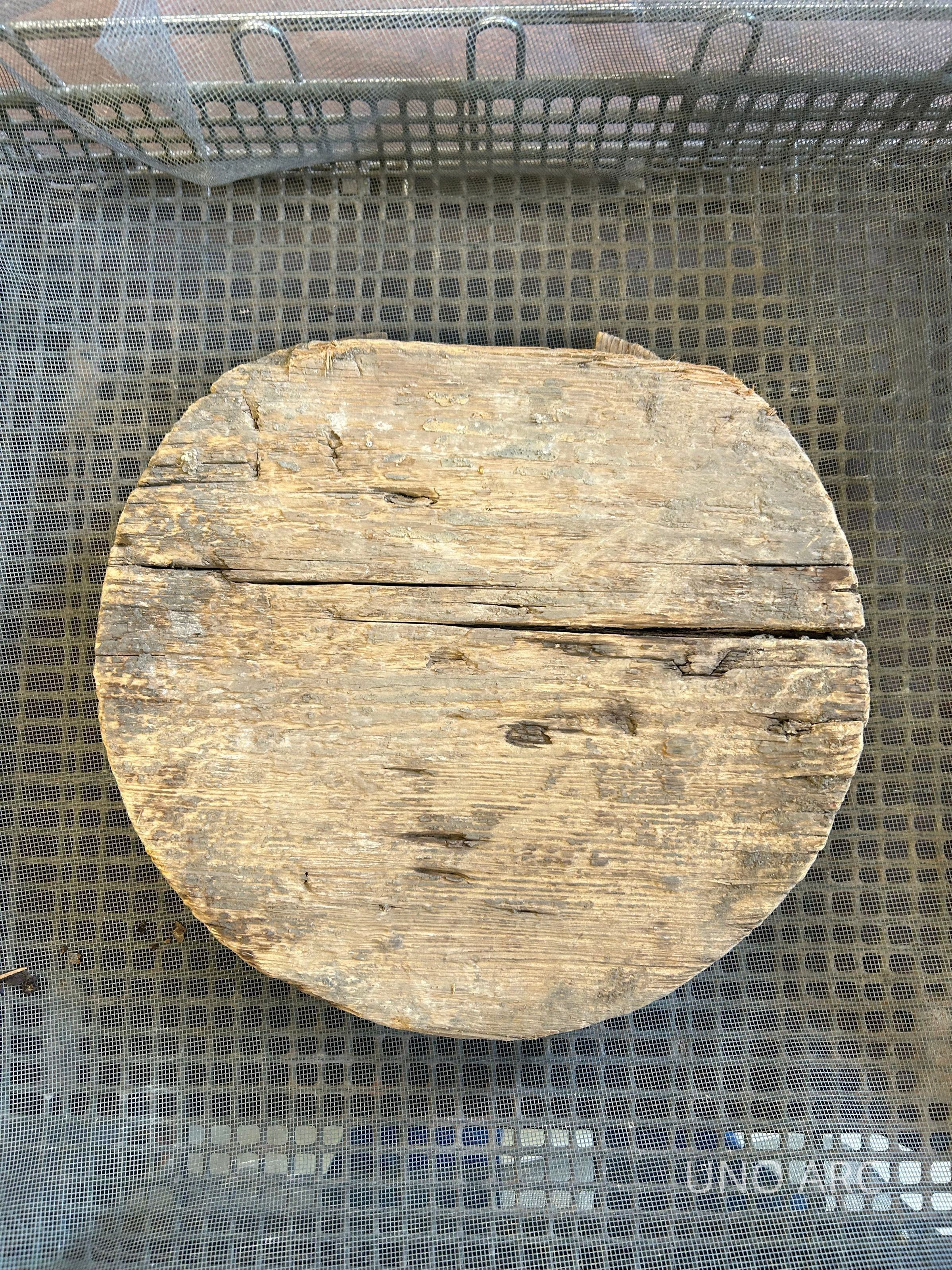 Circular piece of wood with three planks secured to it with nails. Center plank has metal sheet formed around it, going into the gaps between the planksCreated By