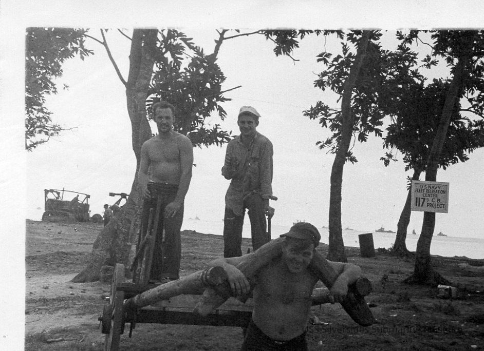 Small photograph of James Kastner with two friends at the US Navy Fleet Recreation Center, 117.