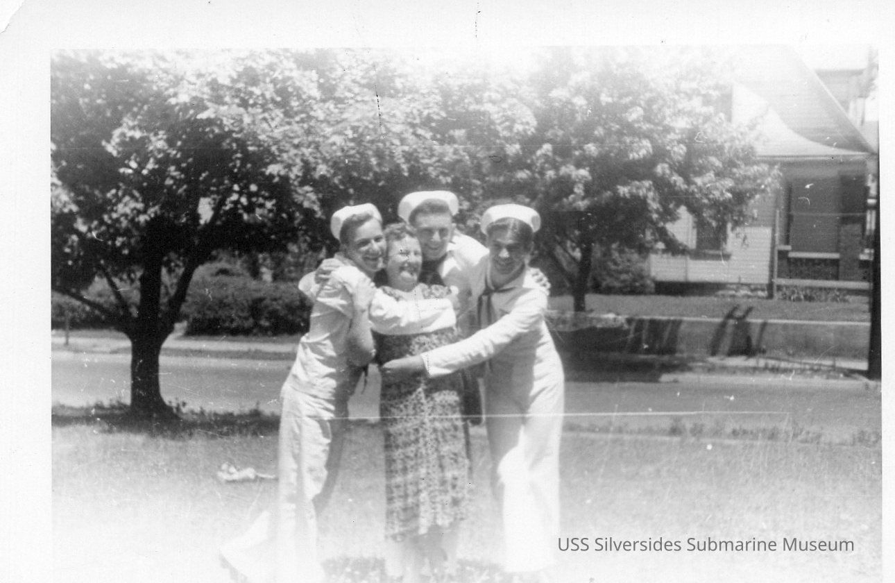Photograph of three sailors all hugging a woman in a dress. The back of the photograph labels everyone in the photo from left to right as Earl Whited (James Kastner's cousin), Eileen Heckels Mother, Bert Heckel, Eileen's brother, and James (Jim) Kastner.Acquisition