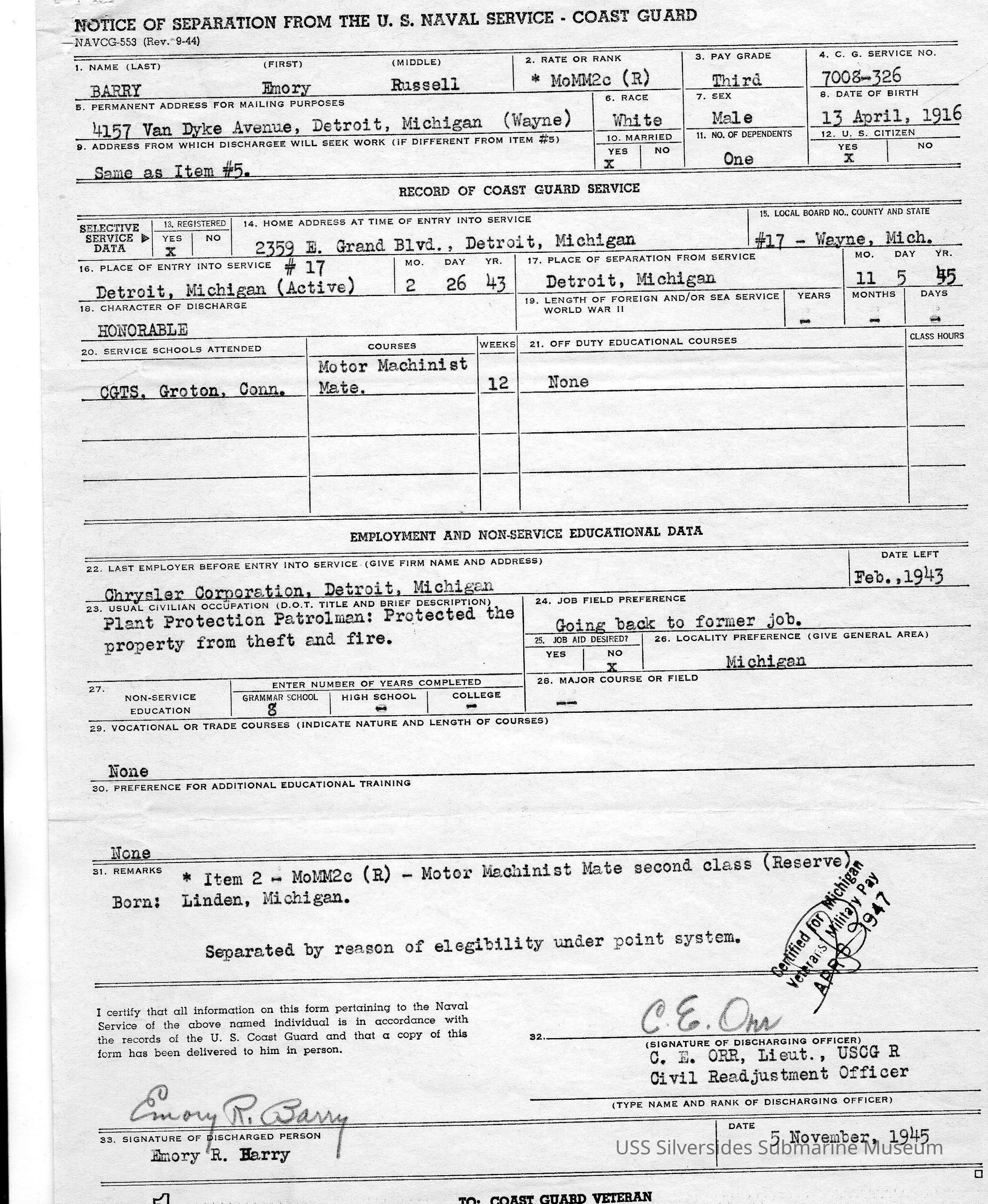 Notice of Separation from the US Naval Service-Coast Guard for Emory Russell Barry. Emory was ranked at MoMM2c (R) and separated from the Coast Guard on November 5, 1945. Emory listed his home address as 2359 E. Grand Blvd. Detroit, Michigan.Acquisition