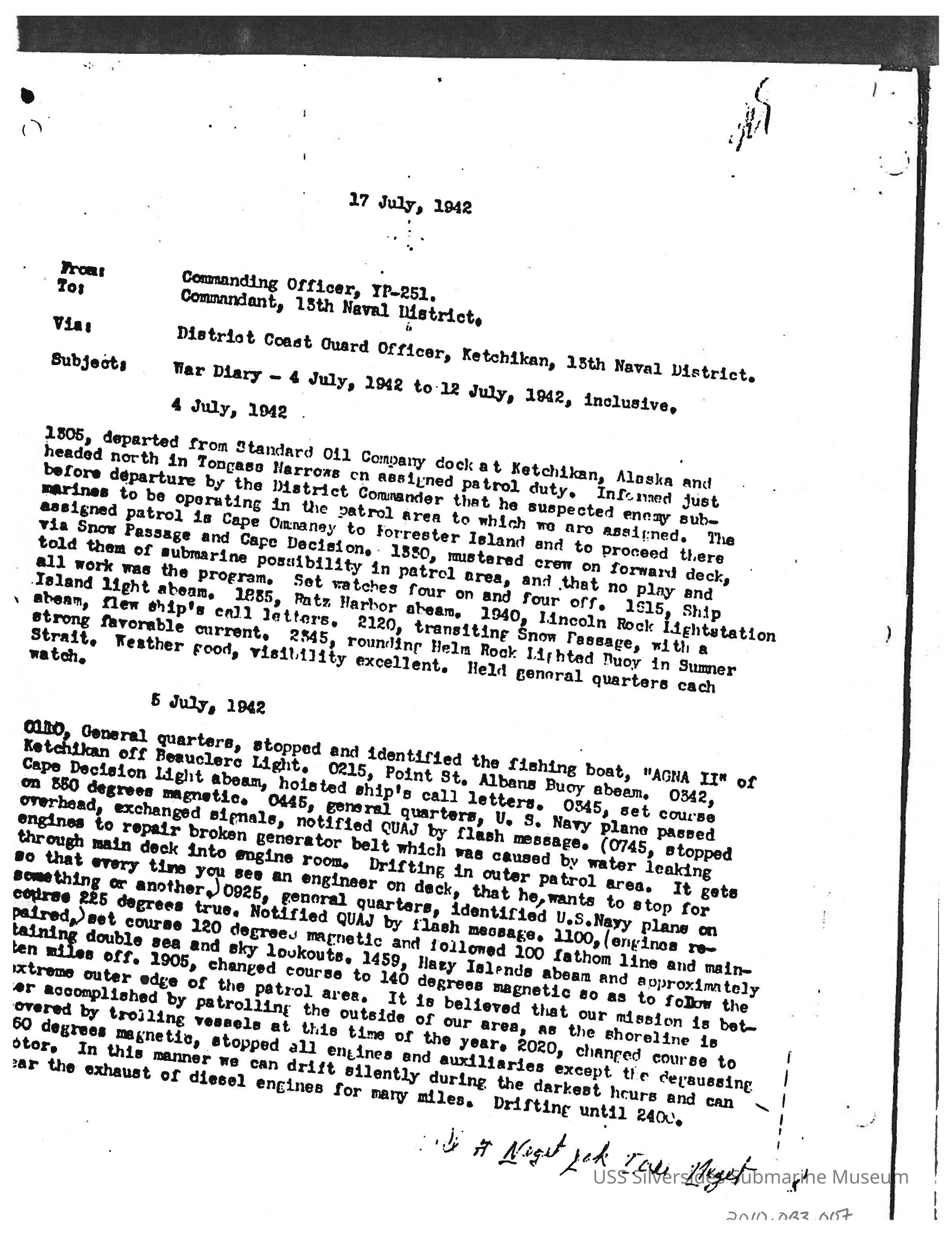 USCGC McLane copy of War Diary 4 July 1942 - 12 July 1942. Eight pages in length.Acquisition