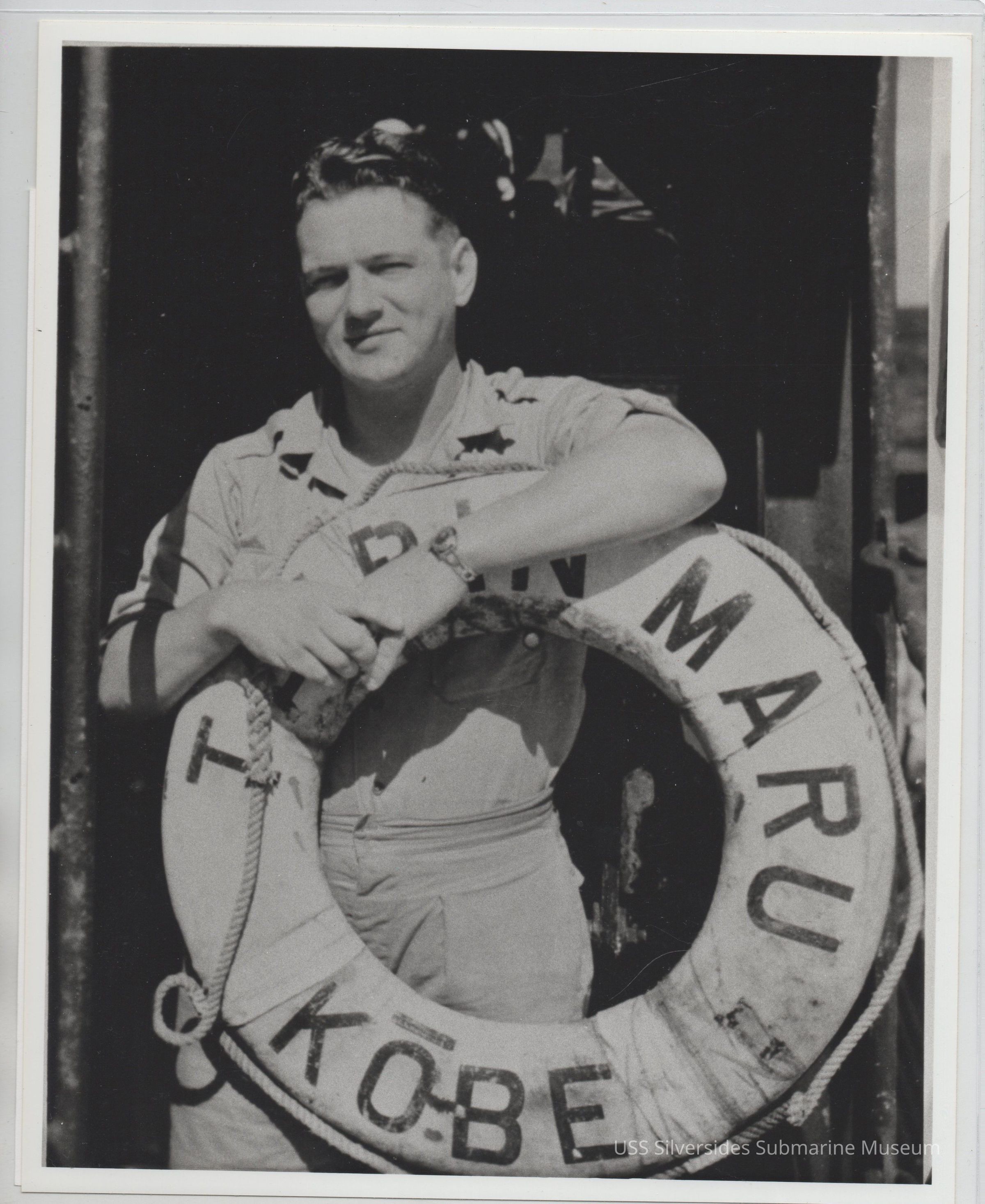 8" x 10" black and white photograph, copy of original photograph label reads: "CDR John S Coye, USN with life preserver from TARIN MARU (Kobe, Japan) TARIN MARU sunk 18 Oct 1943 on 7th patrol. Circa Nov 1943" 5.5" x 8.5"Acquisition