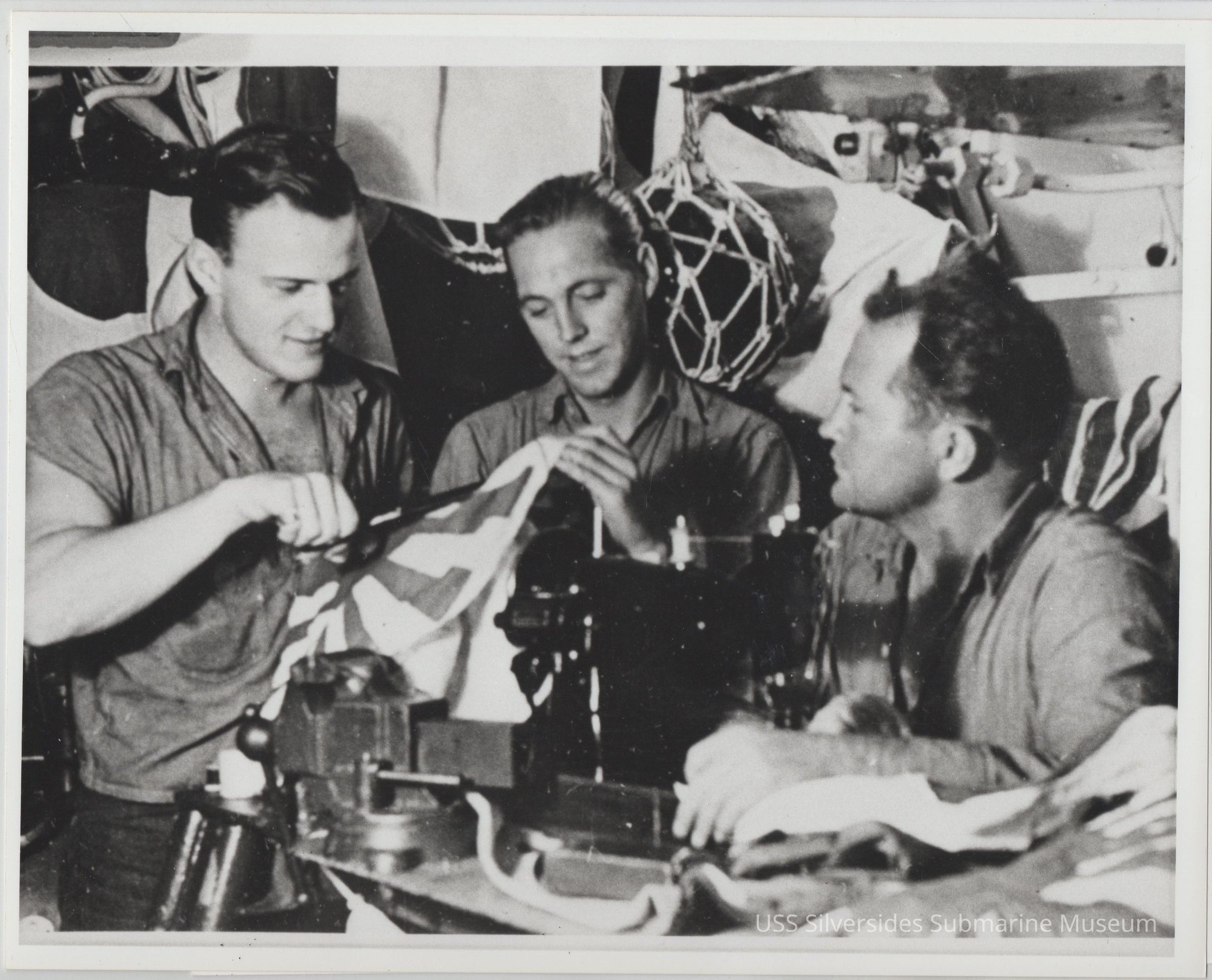 Black and white photograph, copy of original photograph label reads: "Making flags for ships sunk. (L to R) CTM Paul W. Dennis, TM3c William J. Peterson, QM1c Geo. L. Goodman Circa 26 Apr - 11 June 1944" 5.5" x 8.5" printed copy of photograph, in pen: "10th Patrol CTM (AA) TM1c Paul Denis Sep 25, '42 - Wars End" "William J. TM3c Peterson Feb 24, '44 - Summer '44 Making Japanese flags?" "George L. QM1c Goodman Feb 5, '44-Summer '44"Acquisition