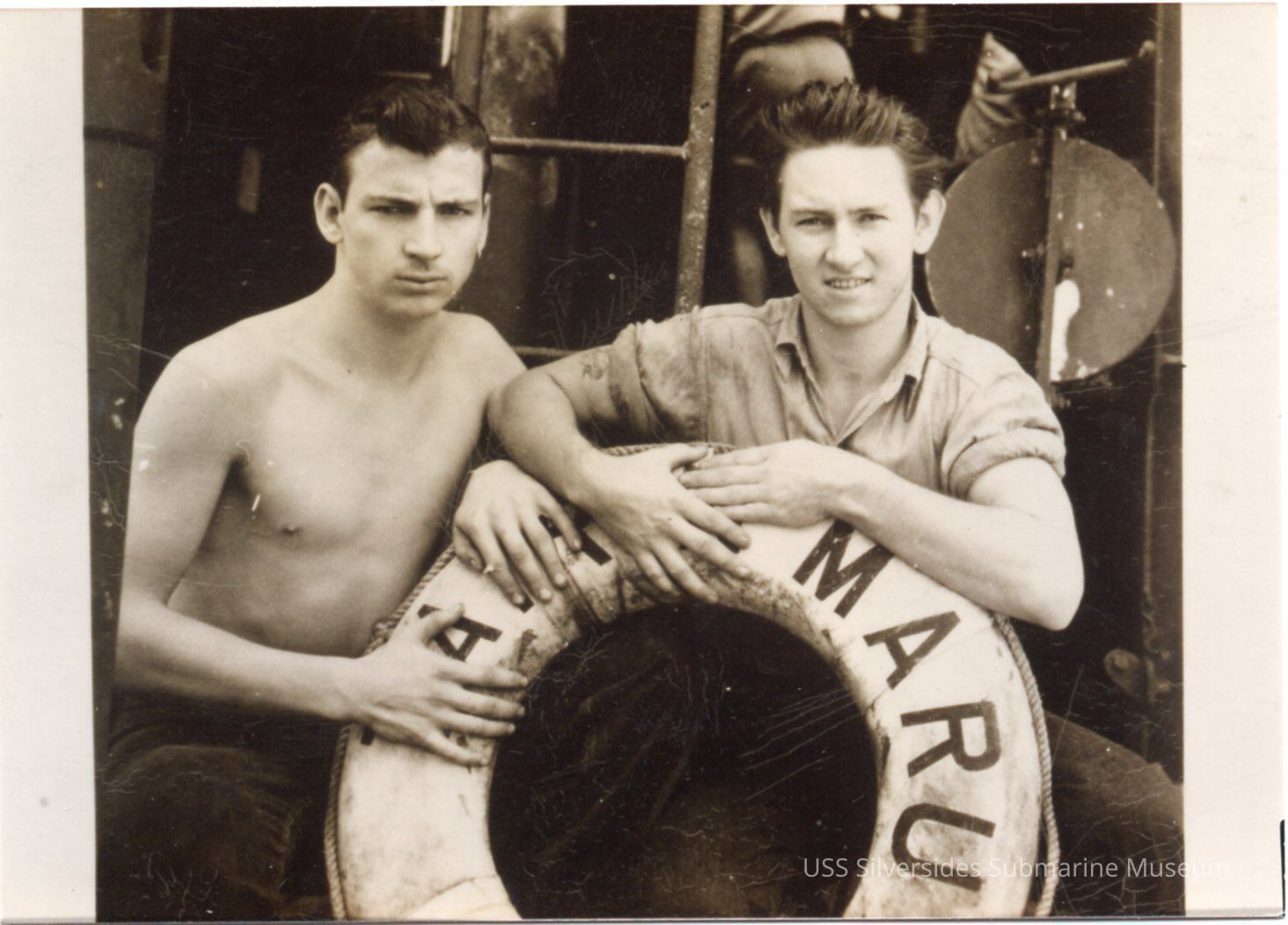 Black and white photo of Bob Williams, Sea 2c/F2c/1c/Momm (left) and Newman B. Workman, MoMM2c holding the Tairin Maru life ring. On the back of the photograph is handwriting in black ink that reads "Bob has no shirt on."Acquisition