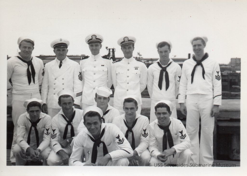 Photo of 9 sailors and three officers in dress whites. The two officers in the back row, center, are presumed to be Finch and Bienia. Another identical photo in the collection calls this photo "Electrical Gang."Acquisition