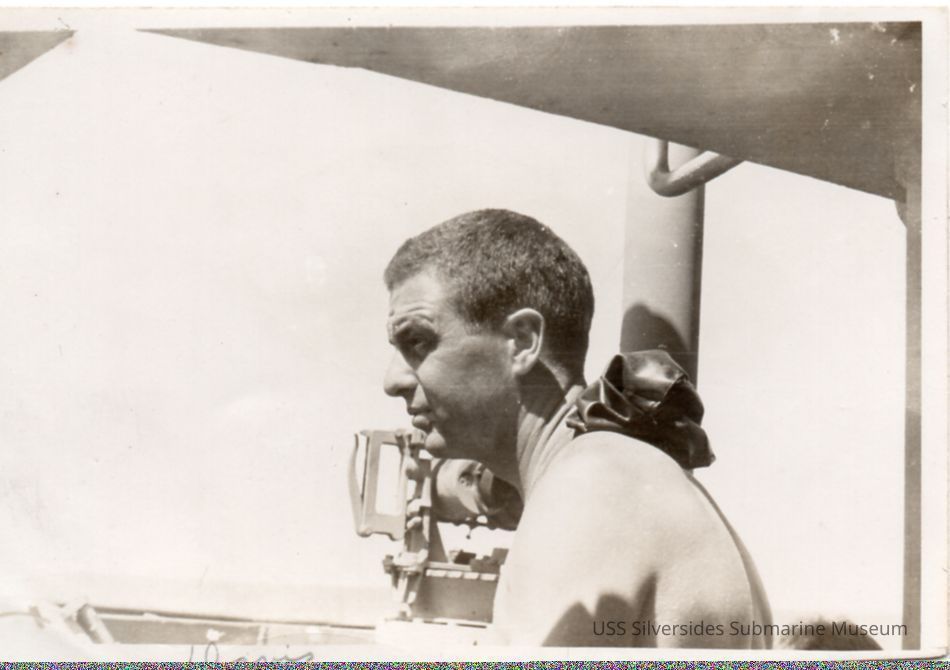 Black and white photo of Lt. j.g./Lt. Hugh B. Davis on the Silversides' bridge.