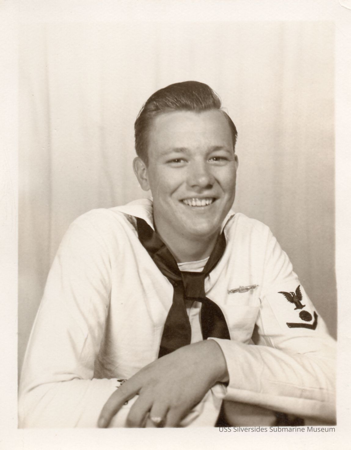 Black and white photo of (based on other photos in the donation) Charles (Phil) Armitstead, crewmate of Robert Vehmeier. It appears to be a professional studio portrait.Acquisition