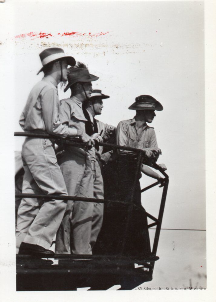Photo of 4 Silversides crewmembers on the cigarette deck. L to R: Lt. Worthington, Capt. Burlingame, Lt. K.G. Nichols, Harold Schwartz.Acquisition