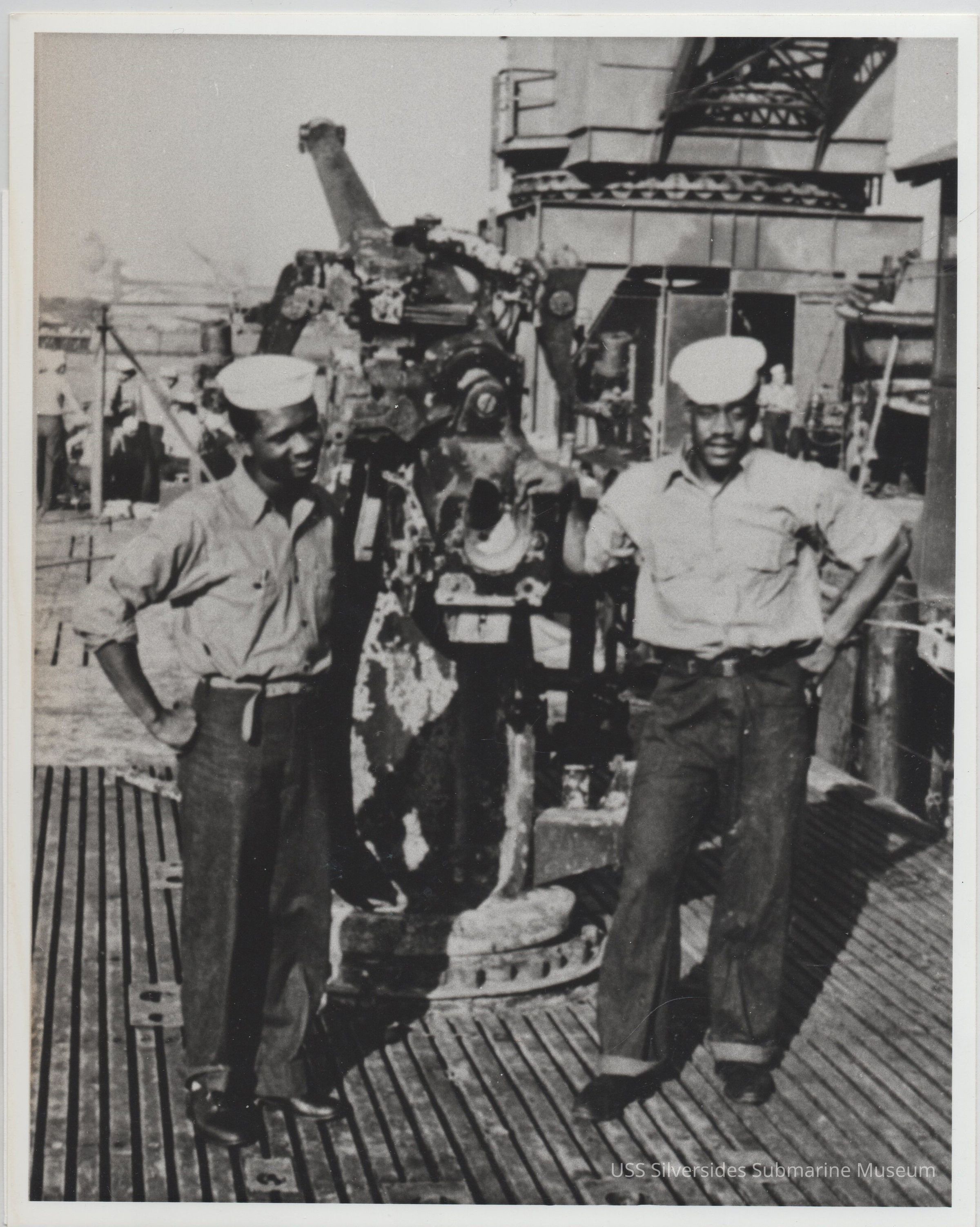 8" x 10" black and white photograph, copy of original photograph label reads: "Anderson Royal MATT1c and William Rapier MATT1c during refit at Pearl Harbor 9 Sept - Oct 1942" 5.5" x 8.5" printed copy of photograph, in pen: "Royal Rapier Pearl Harbor - Sept. 1942 (between patrols 2 & 3) by 3" 50 cal deck gun Matt 1/c Royal, Anderson P. 28 JUN '42 - SUMMER '43 Matt 1/c Rapier, William F. 10 July'42 - DEC 11 '42"Acquisition
