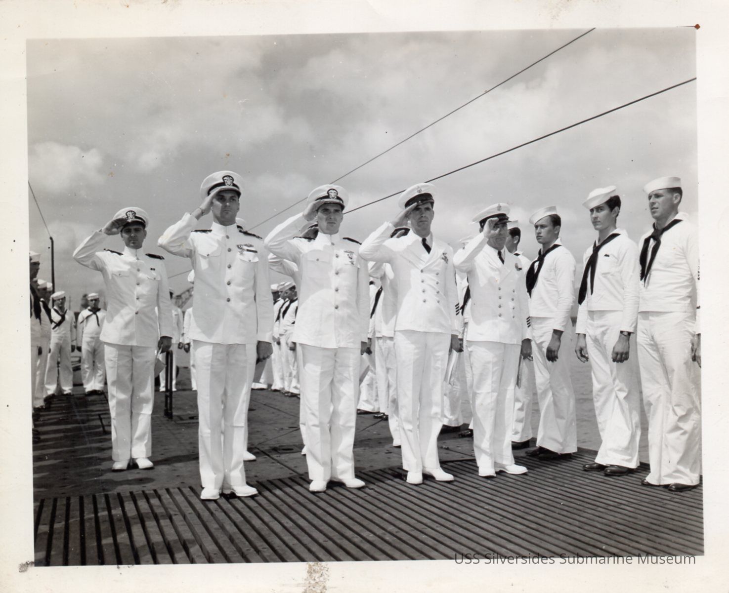 Officers saluting during an awards ceremony. L to R: (?), Lt. Worthington, Lt. Keegan, CRM AA Stegall, and CTM-AA/PA Robert Anderson.Acquisition
