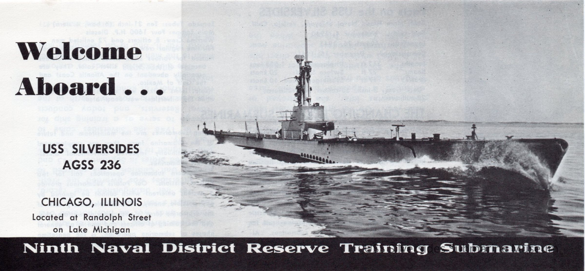 USS Silversides AGSS-236 Naval Reserve Training Submarine pamphlet. Pamphlet has a picture of the USS Silversides on the front with the text "Welcome Aboard...USS Silversides AGSS 236" to the left of it. On the inside, the pamphlet talks about the history of the USS Silversides. The back of the pamphlet discusses the "Corn Belt Fleet."Acquisition