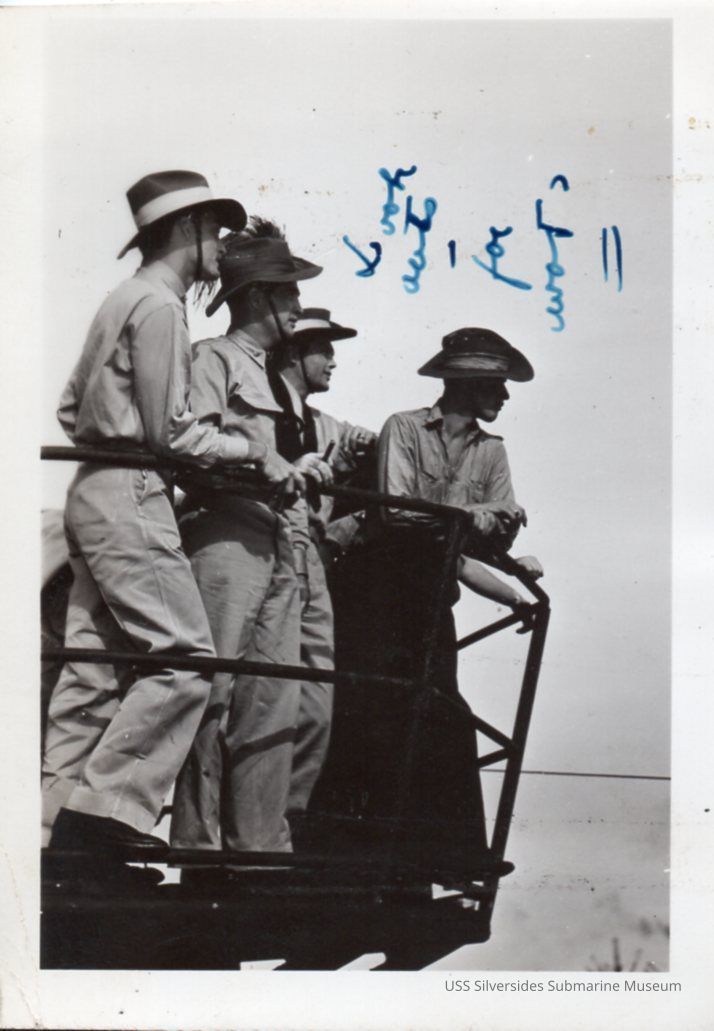 Photo of 4 Silversides crew members on the cigarette deck of the sub. L to R: Lt. Worthington, Capt. Burlingame, Lt. K.G. Nichols, Harold Schwartz. Writing on the photo appears to read: "Lookouts for war."Acquisition