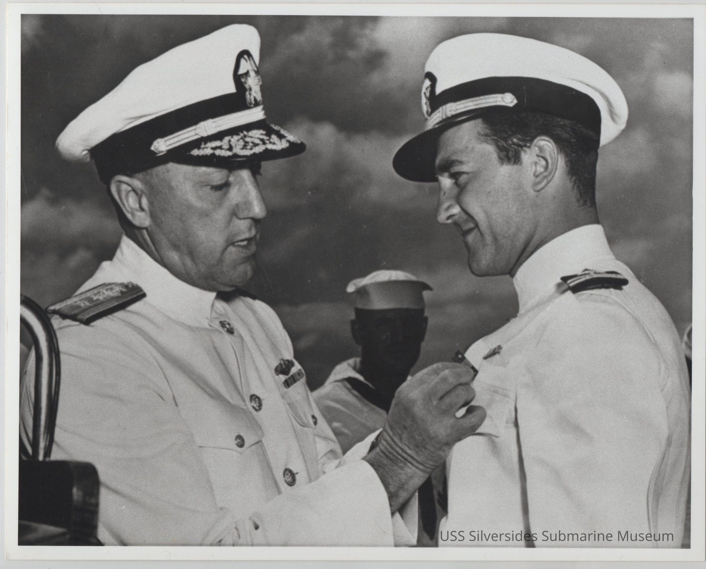 Black and white photograph, copy of original photograph label reads: "RADM Charles Lockwood, USN (COMSUBPAC) presenting Navy & Marine Corps Medal to Lt. John Bienia, USNR Pearl Harbor, Hawaii, 21 Mar 1943 NA#80-G-38811" 5.5" x 8.5" printed copy of photograph, in pen: "80-G-38811 21 March 1943 RADM Charles A. Lockwood LT. John Bienia Bienia Presenting Navy & Marine Corps Medal at Pearl Harbor (After 4th Patrol)"Acquisition
