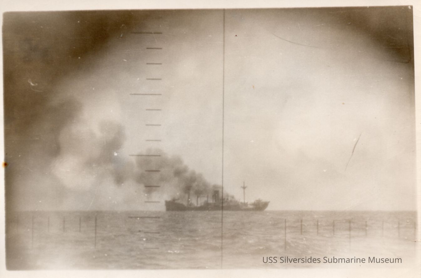 Black and white photo of a ship burning at sea. The photo is taken from a periscope. Writing on the reverse reads: Bombed by Silversides; Japanese Merchant Ship.Acquisition