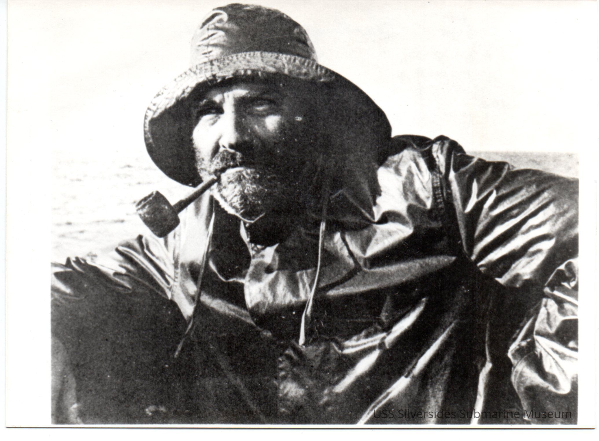 A black-and-white photograph of Captain Creed Burlingame shows him in a rain jacket and hat with a pipe in his mouth. On the back are the words "Captain Burlingame, Creed 1942."Acquisition