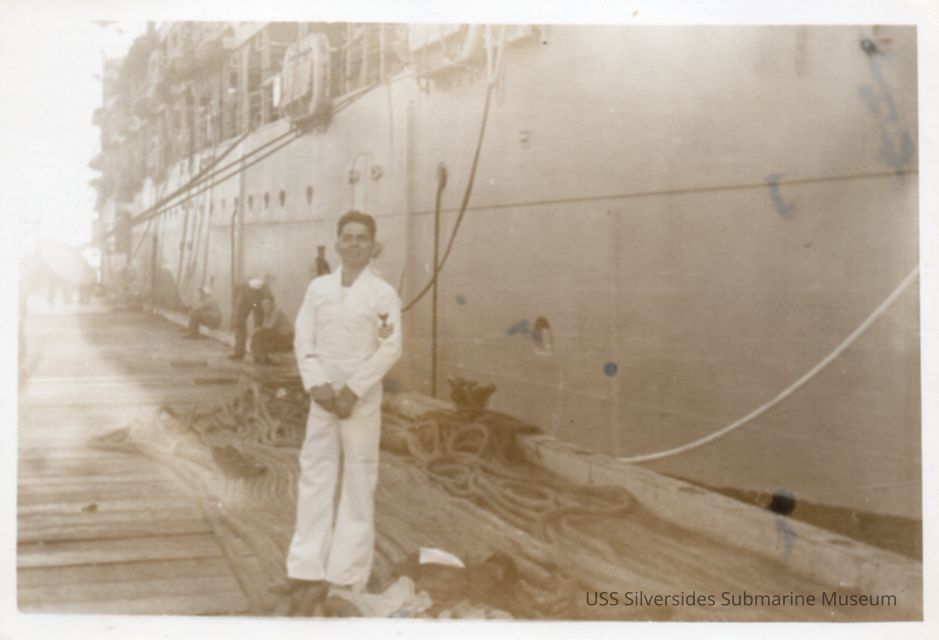 Black and white photo of Calvin S. Lloyd at Midway. Lloyd is in Navy whites standing next to a ship presumed to be the submarine tender USS Orion (AS-18). This ship has been refered to in other photographs in this collection.Acquisition