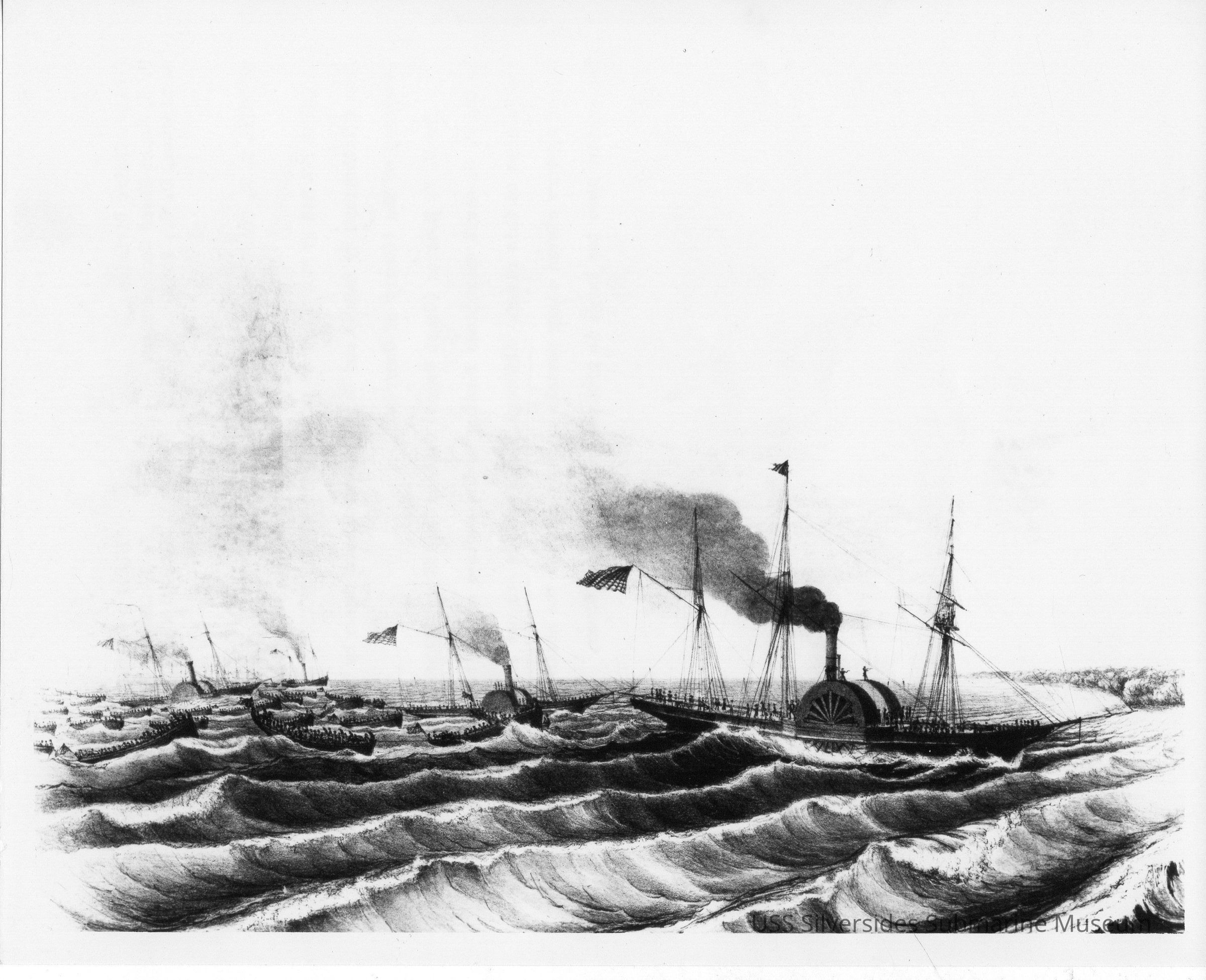 Picture depicting Coast Guard Cutters during 1847 originally from a lithograph. Discusses one of the original McLane vessels. On the back of the picture is text describing the photograph. Copied from the National Archives.Acquisition