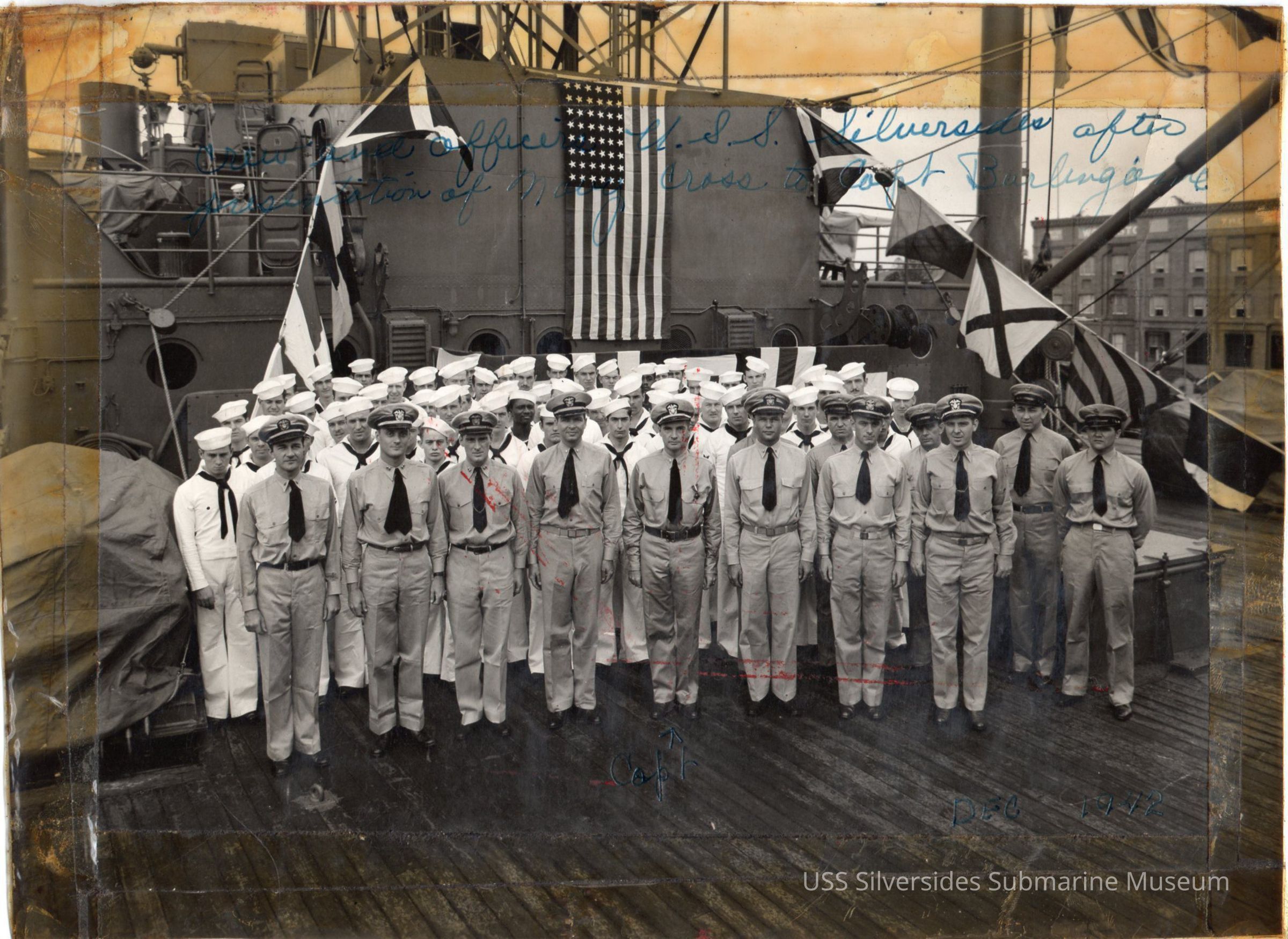 Photo of Silversides crew and officers following the presentation of the Navy Cross to Capt. Burlingame, December, 1942.Acquisition
