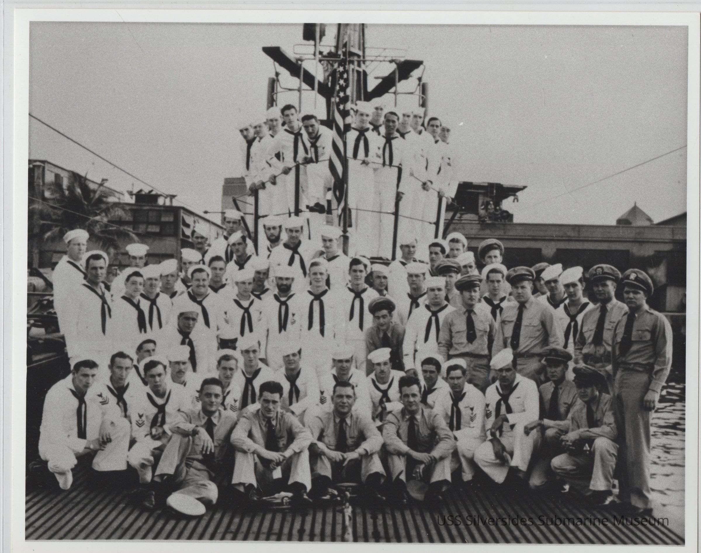 8" x 10" black and white photograph, copy of original photograph label reads: "Crew USS Silversides (SS 236) 7th Patrol - Nov 1943 Pearl Harbor, HI" 5.5" x 8.5" printed copy of photograph, in pen: "Officers's Names- Keegan Worthington Bienia Nichols Coye Cole Malone Crew of 7th Patrol (Oct-Nov 1943) Worthington Keegan Coye Bienia Nichols Smiley"Acquisition