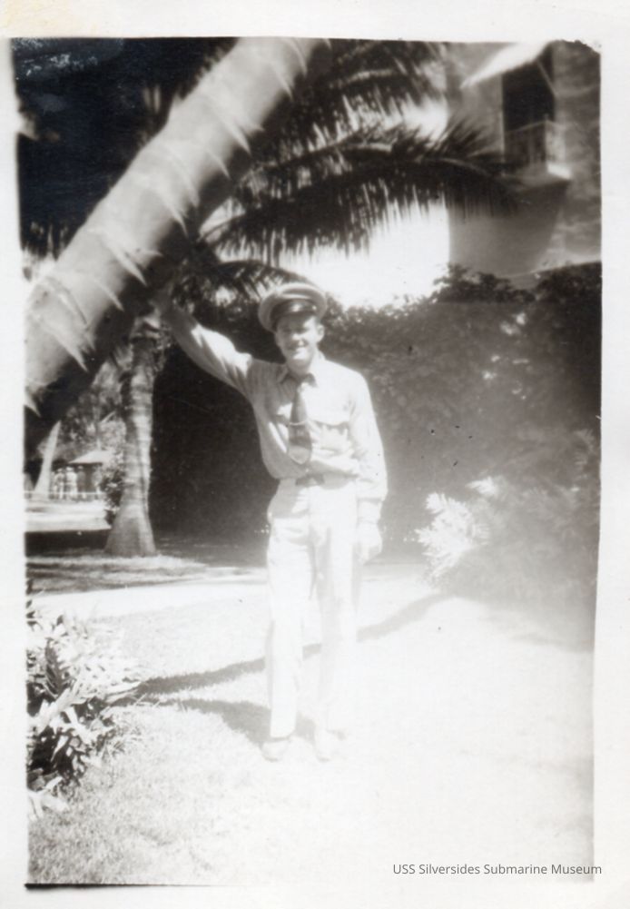 Black and white photo of CTM Paul Dennis near a palm tree. Writing on the reverse reads: Dennis, Honolulu Hotel.Acquisition