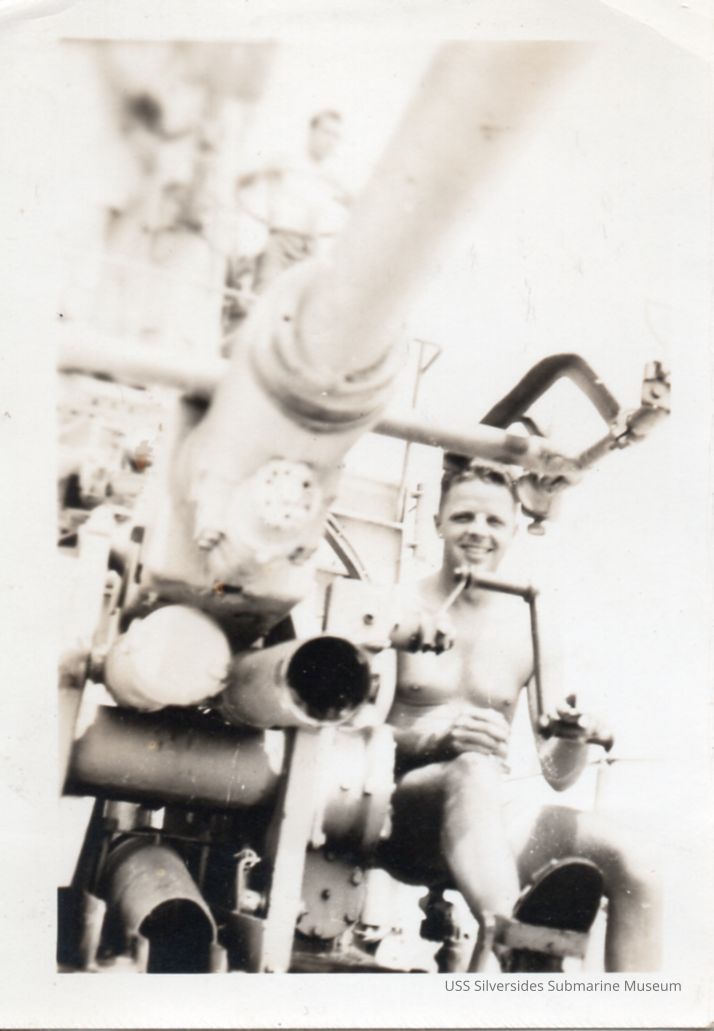 Black and white photo of PhM1c William F. "Doc" Cannon sitting on the deck gun of the Silversides.Acquisition